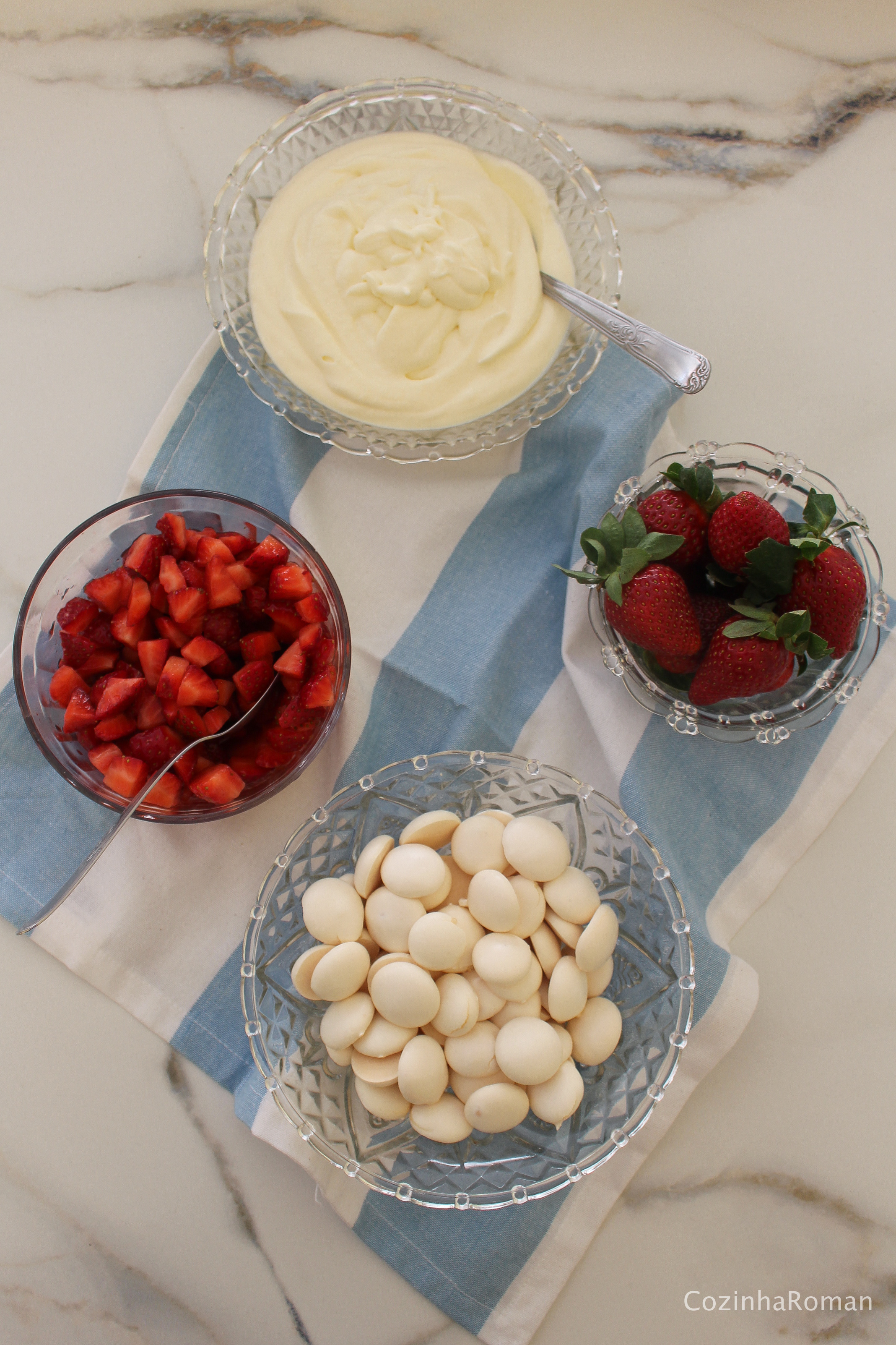 Lave e seque bem os morangos. Pique-os em pedaços não muito pequenos e cubra com uma colher de açúcar. Enquanto os morangos marinam no açúcar, bata o creme de leite até atingir ponto de chantilly. Acrescente o restante do açúcar e misture bem, mas com cuidado para não bater demais.