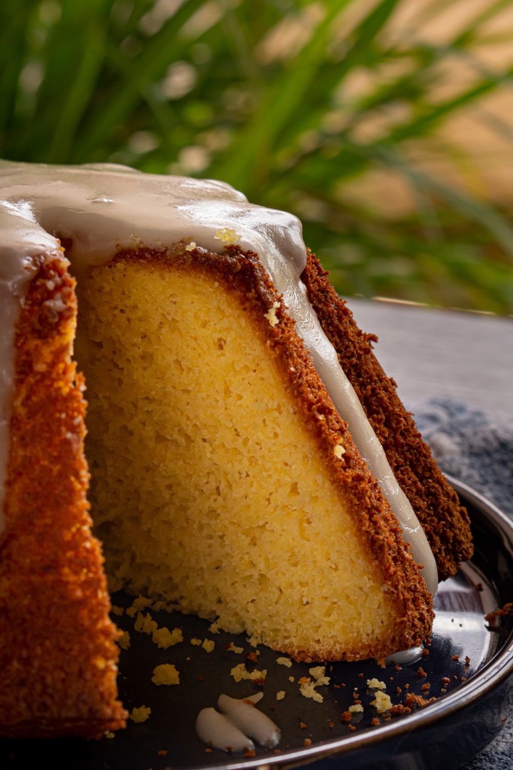 Esse bolo é uma adaptação do que eu conheço como bolo d’água, uma espécie de pão de ló adicionado de um líquido que serve como saborizante. E de um pouco de fermento pra equilibrar a coisa toda. É um tipo de bolo mais sequinho, como o pão de ló, e muito muito leve! Eu considero ideal pra fazer pavês, bolos confeitados ou outras sobremesas. Mas também gostei dele assim, mais simples, apenas com um glacê no topo.