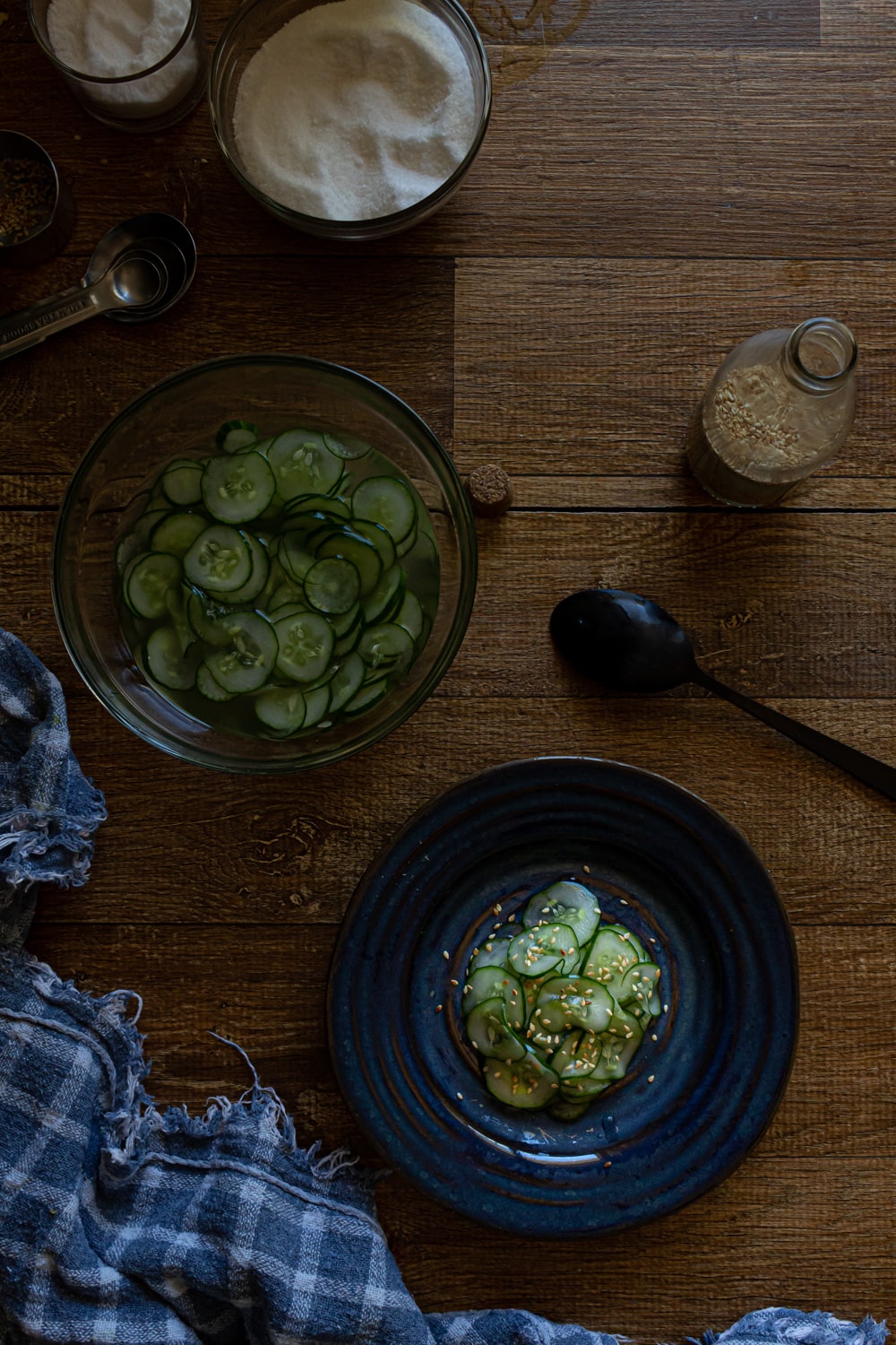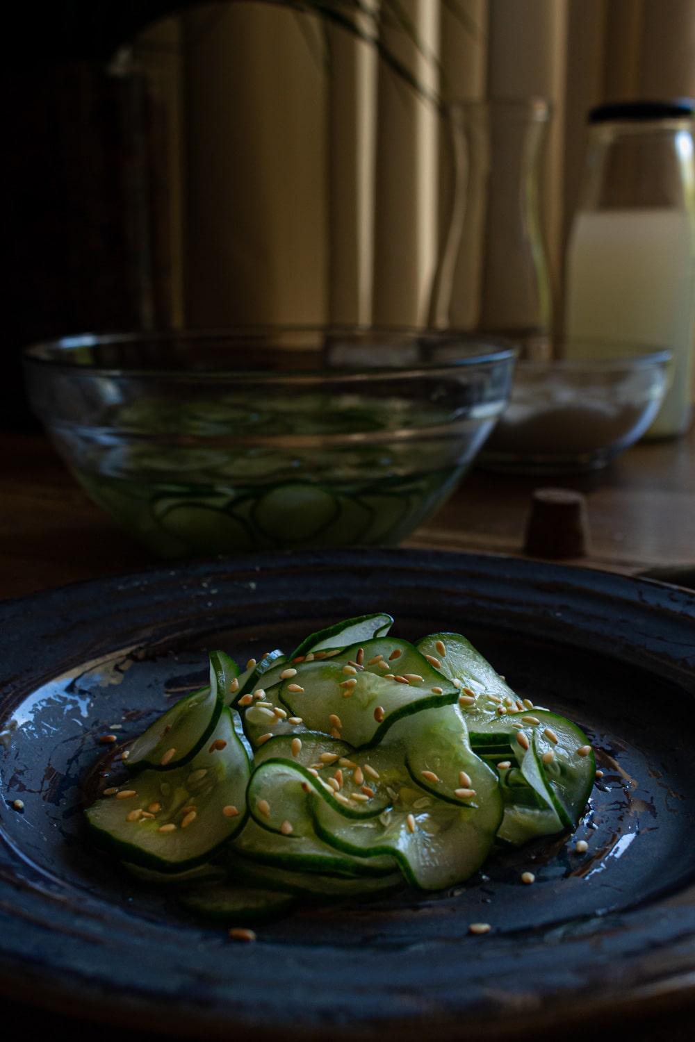 - Misture o vinagre com a água, o açúcar e o sal. Escorra o pepino, descartando a água, e junte no líquido preparado. Deixe descansar 30min na geladeira, ou guarde em um pote fechado, na geladeira, por alguns dias. Sirva com um pouco de gergelim.