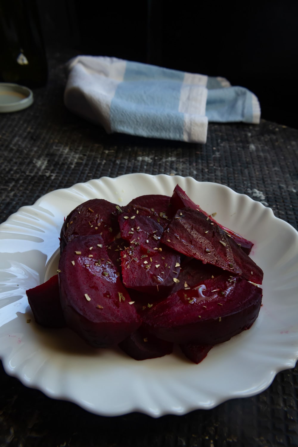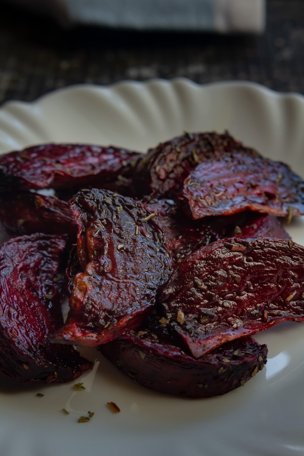 Agora o segundo método é assar a beterraba já descascada (ou não) e picada. Eu costumo partir em gomos, cobrir tudo com azeite e temperar com sal e alguma erva. Para a das fotos eu usei sálvia seca, mas já experimentei (e gostei) com alecrim, tomilho, orégano… E o resultado é bem diferente! Com esse método a beterraba vai secar no forno. O sabor fica mais intenso e a textura muda completamente, ficando mais sequinha e firme. Também combina com saladas mas eu gosto de fazer pra acompanhar caldos e purês. E você pode cortar em gomos, fatias, cubinhos, como preferir!