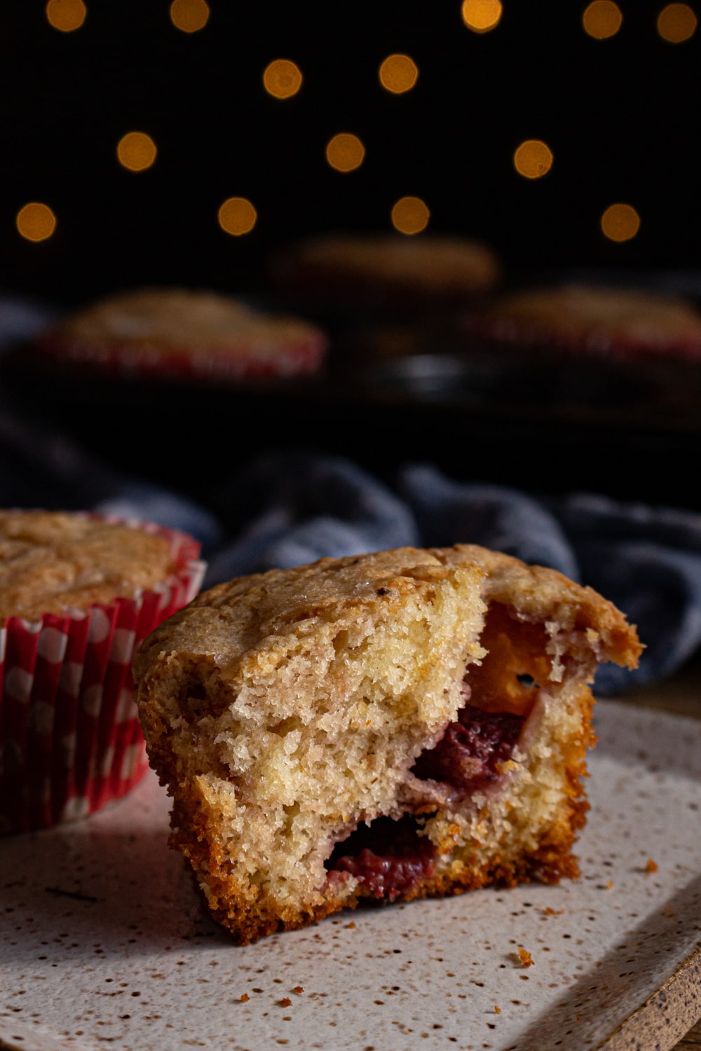 O grande “tchan” de usar frutas congeladas é que quando assadas assim elas acabam virando uma geleia. E aí temo um bolinho de massa fofinha com poças de geleia onde antes estava um pedaço de fruta.