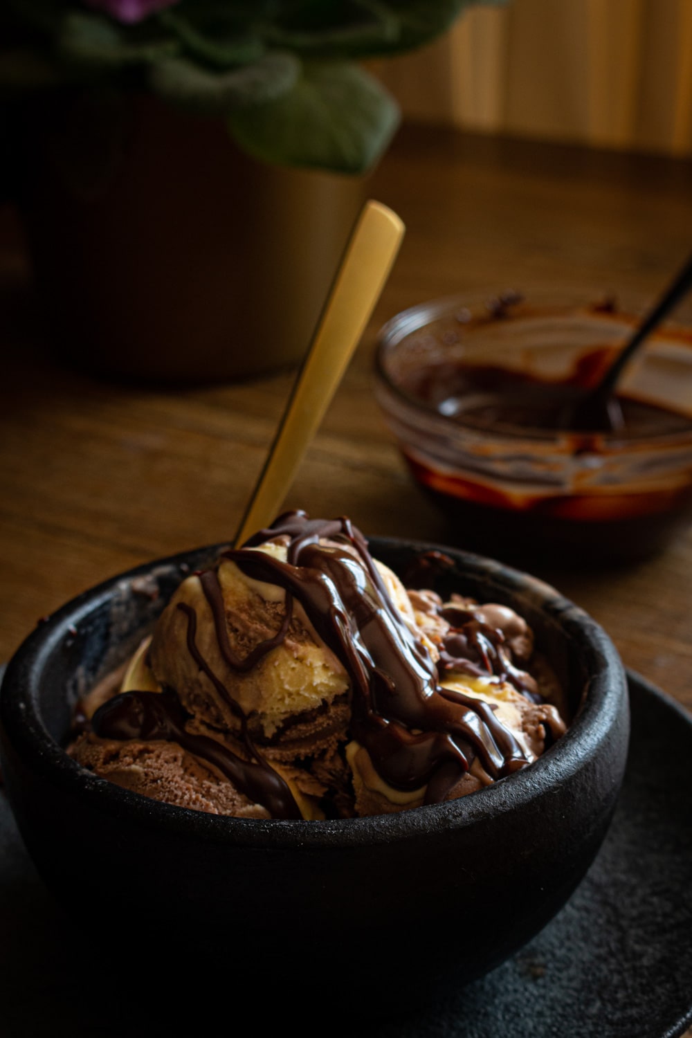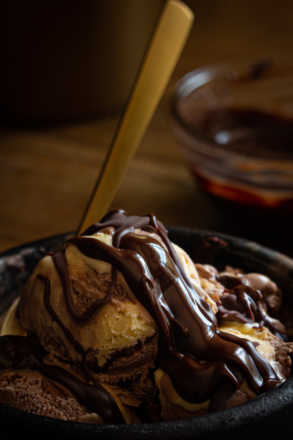 Foi em 2015, no início do Cozinha, que eu quis fazer uma ganache molinha pra acompanhar um sorvete mas não tinha creme de leite em casa. Acabei improvisando com leite e manteiga e o resultado foi uma calda de chocolate bem gostosa.