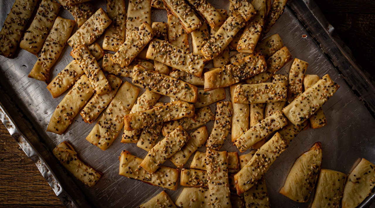 Biscoitinhos crocantes com massa fermentada, tipo massa de pão, e que pode ter todo tipo de cobertura dependendo do gosto