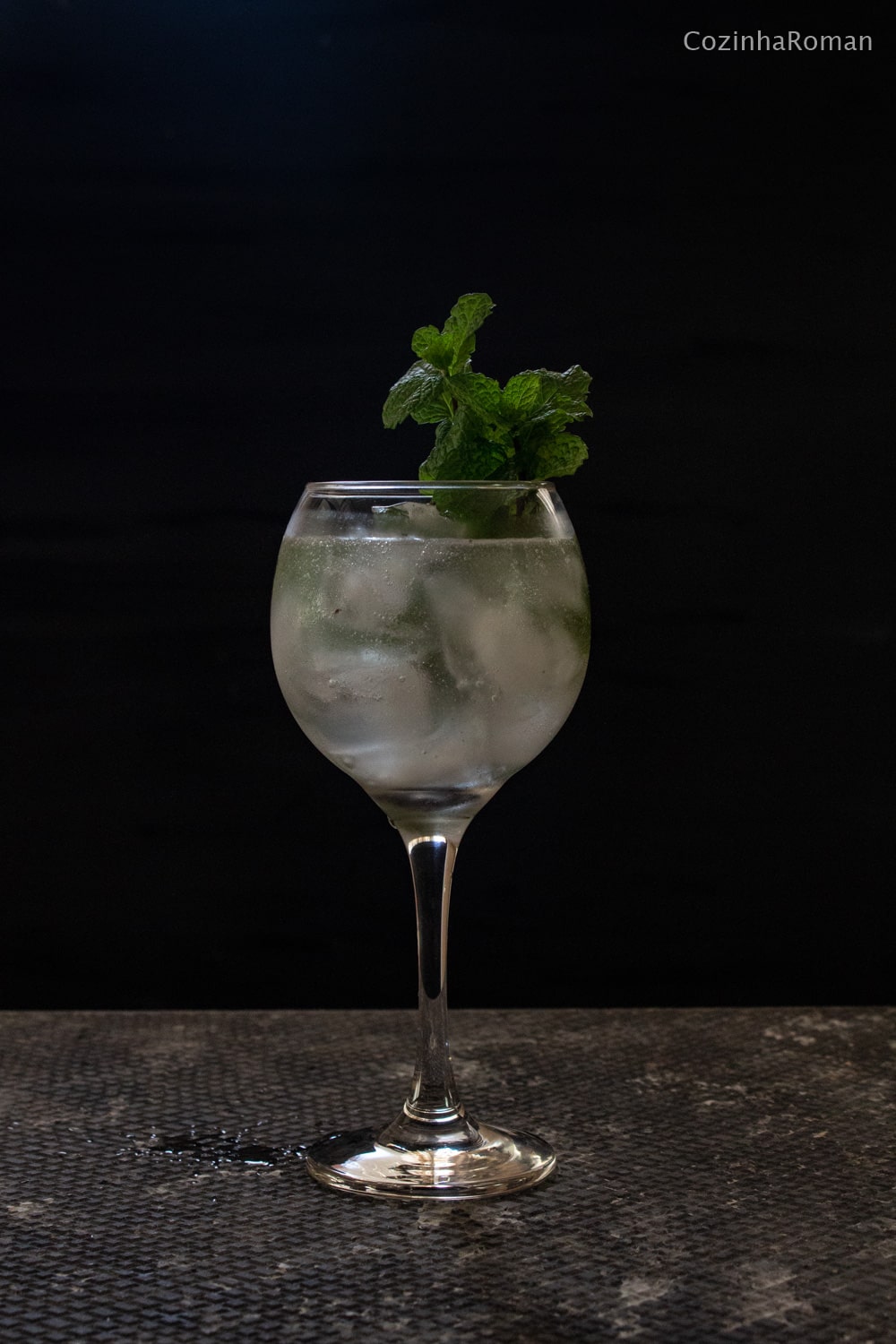 Atualização: Em 2019 tirei novas fotos desse drink e aproveito pra deixar a dica: amasse muito bem as folhas de hortelã antes de misturar as bebidas; coe e não use as folhas amassadas no drink; e então sirva com um raminho de hortelã fresco para aumentar ainda mais o perfume.