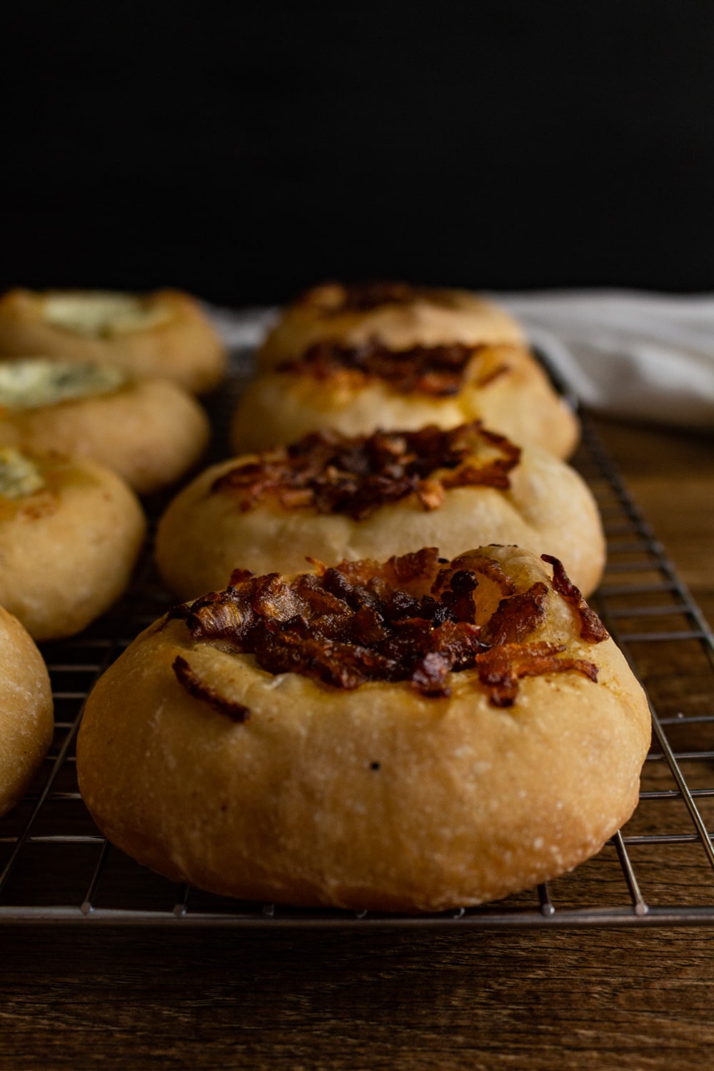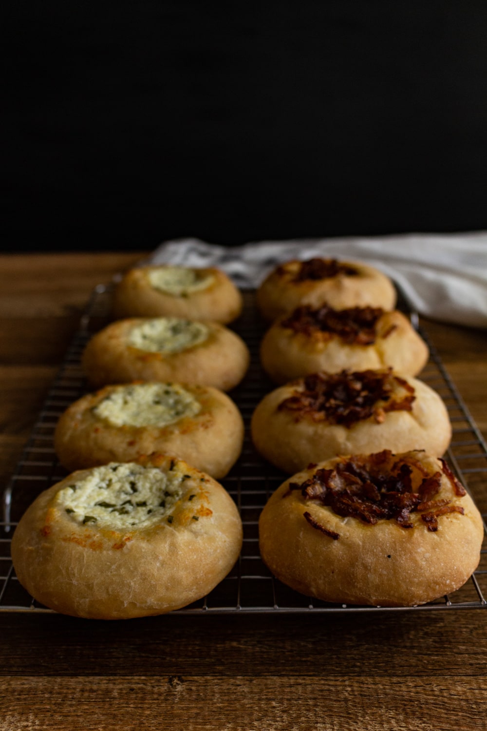 Bialys! Sabe esfiha aberta? Um disco de massa com bordas mais gordinhas e o meio “coberto pelo recheio”? Bialys são quase isso.