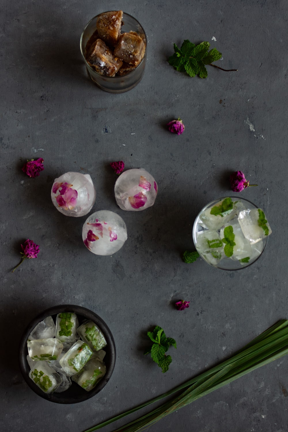 Faz assim, pega seu sabor favorito. Na foto tem capim limão, hortelã, rosas e até café! Você pode apenas picar as folhas das ervas e usar para fazer as pedras de gelo; ou pode fazer o próprio chá escolhido e fazer o gelo com ele. Os cubos de café são justamente do café que sobrou de manhã e que foi pro congelador logo em seguida!
