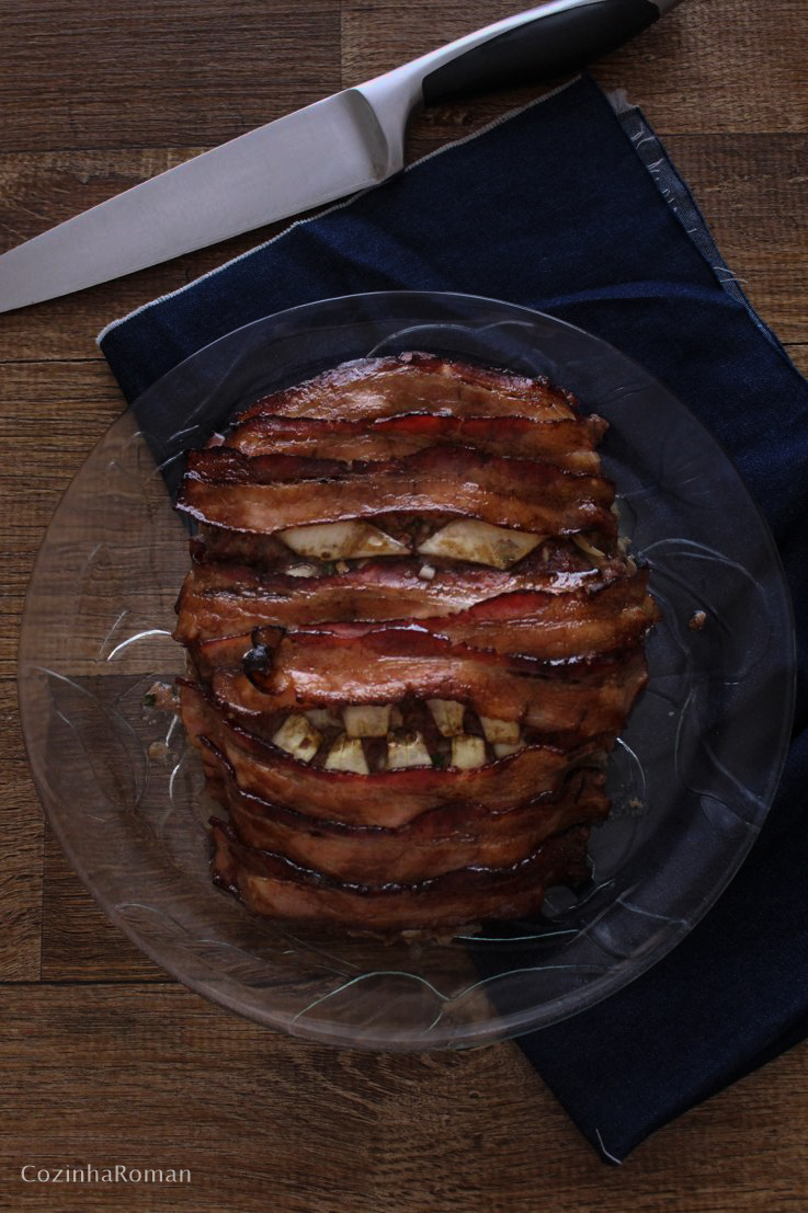 Tem uma pseudo receita abaixo, mas vale temperar a carne moída com o que você preferir. Eu usei a redução de balsâmico que já apareceu aqui para pincelar o bacon, e deu um sabor muuuuito bom mas, como sabemos, bacon por si só já vale a pena. E é sempre bom lembrar que a múmia pode virar um mundo de outras coisas, a depender da sua imaginação e/ou da data comemorativa.