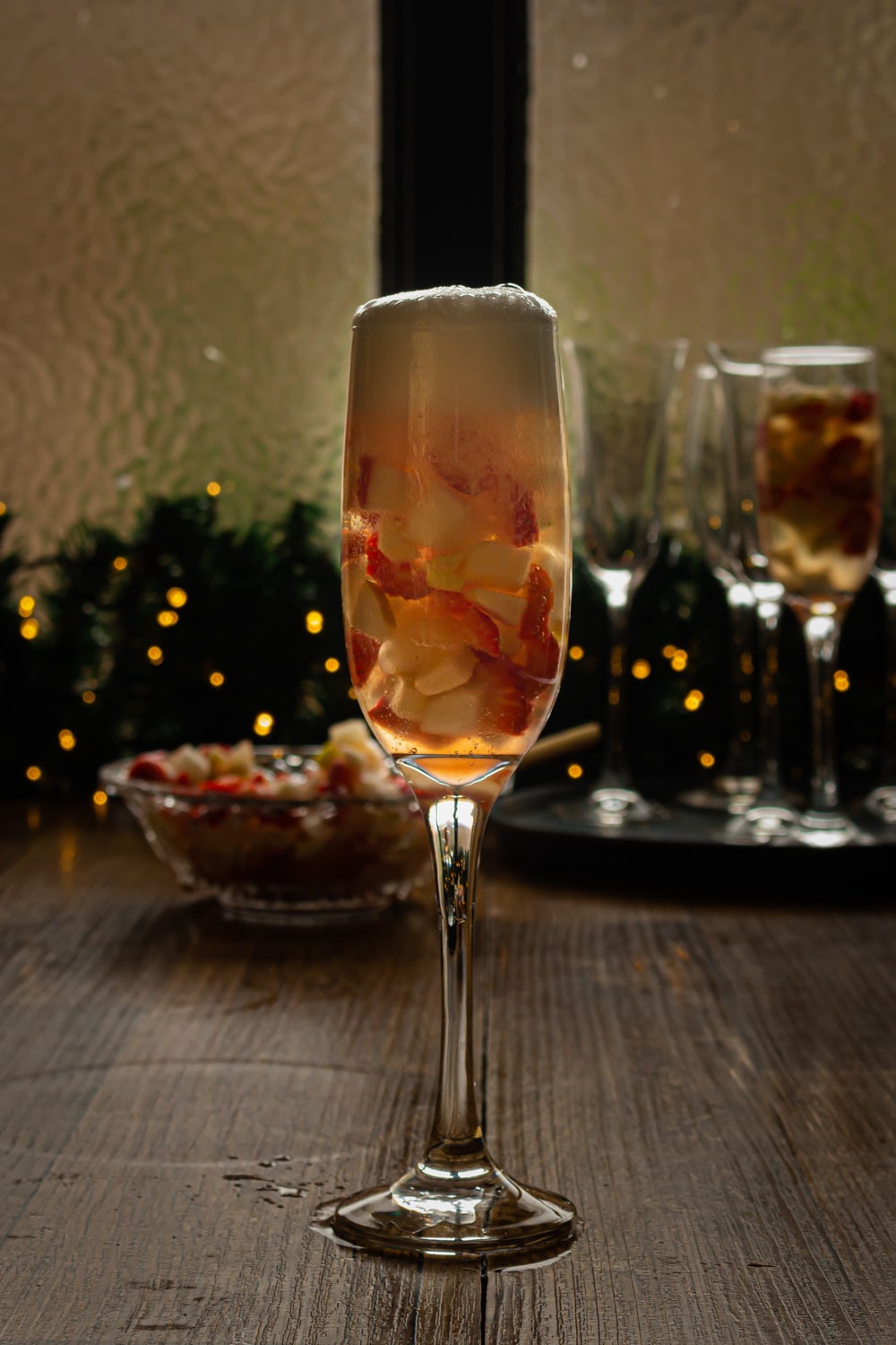 - Deixe as frutas na geladeira até a hora de servir. Então coloque duas colheres das frutas em cada taça longa e complete com o espumante