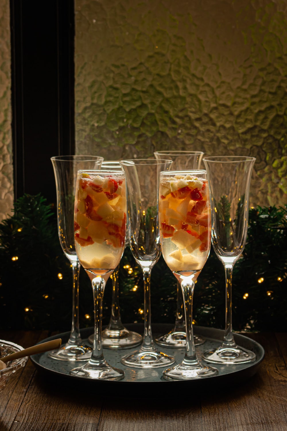 Por último, a apresentação. O mais comum é o Clericot ser servido como um ponche, com as frutas imersas na bebida. A primeira vez que fiz essa receita foi assim mesmo que fiz. Mas em 2022, quando refiz essas fotos, todos os drinks foram pensado como um “bar de festa”, onde cada pessoa se serve e monta seu drink como preferir. Então as frutas foram servidas em uma vasilha delas, ao lado de uma garrafa de espumante, que poderiam ser várias garrafinhas também. Um lado bom de servir desse jeito é que dá pra fazer uma versão não alcoólica, com suco de frutas e água com gás pra quem preferir também.