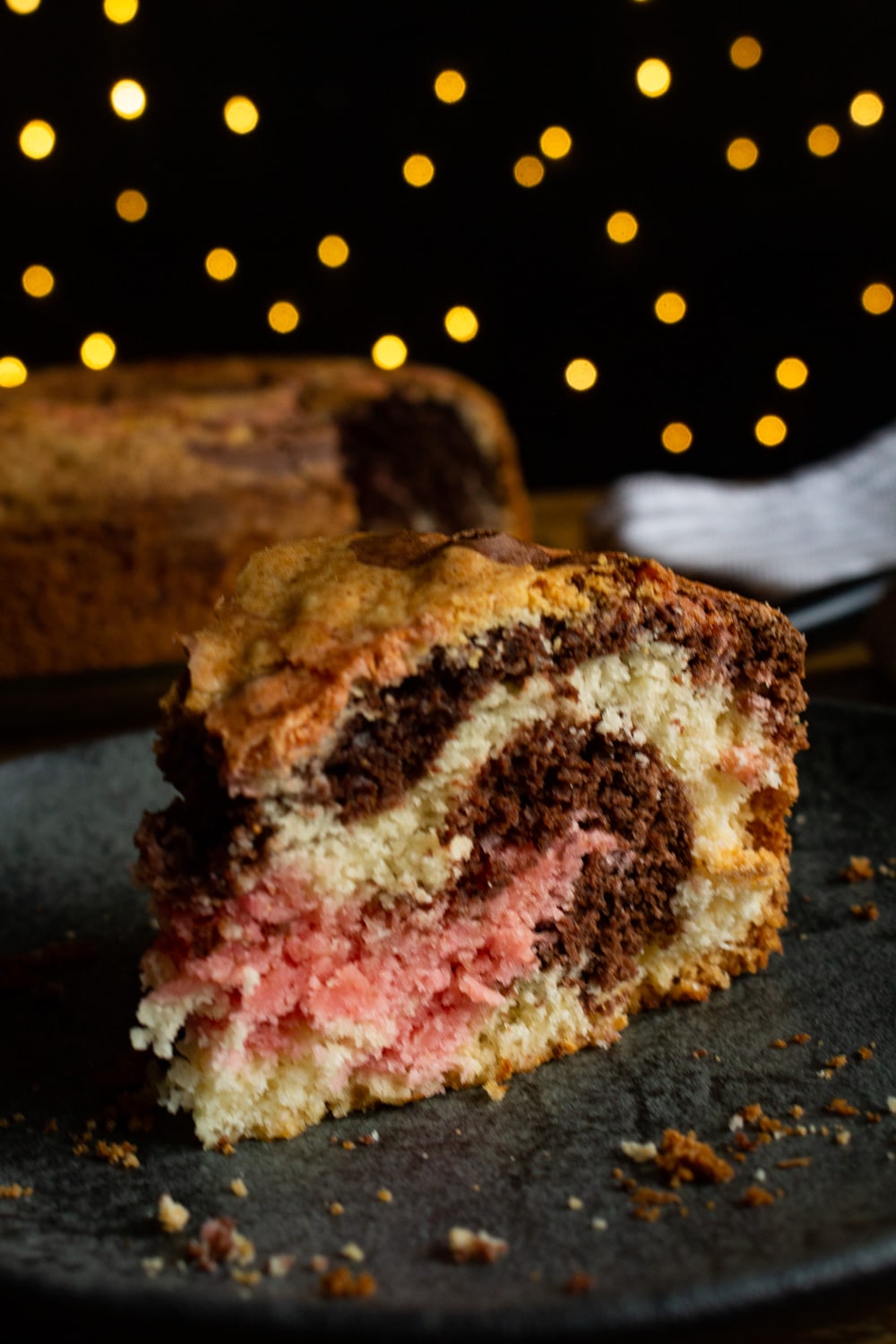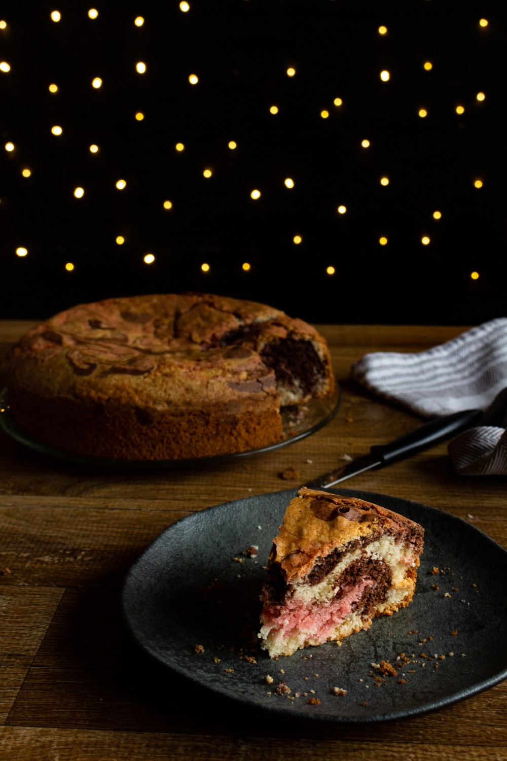 Ainda nas substituições: pra quem prefere usar cacau não tem problema; pra quem prefere usar achocolatado também não tem problema. O cacau resulta num sabor mais forte e menos doce; o achocolatado dá um resultado mais doce e suave. E por último a forma! Eu tentei fazer numa forma redonda sem furo no meio pra mostrar bem o marmorizado colorido no topo do bolo. Só que isso não deu muito certo. Ele demorou tanto a assar que dourou muito no topo e no fundo, escondendo o colorido, e ainda afundou no meio. Uma forma de furo no meio, de uns 20-25cm vai funcionar melhor. Se preferir um tabuleiro um de uns 20x30cm deve funcionar também, embora eu ainda não tenha testado!