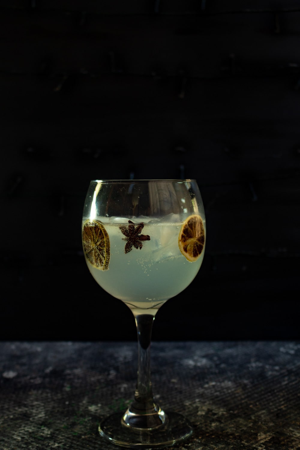 Encha uma taça larga com algumas pedras de gelo, ajeite o limão e o anis entre elas. Cubra com o gin e complete com a tônica. Prove e acerte a proporção ao seu gosto.