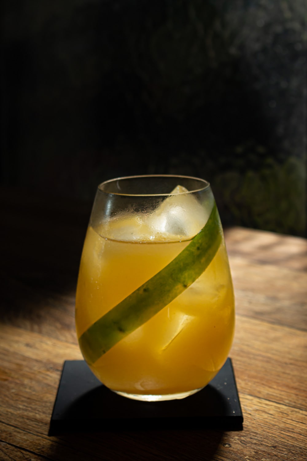 Encha um copo baixo com pedras de gelo e coloque a fatia de casca de pepino contornando a volta interna do copo. Use o gelo pra segurar a casca no lugar.