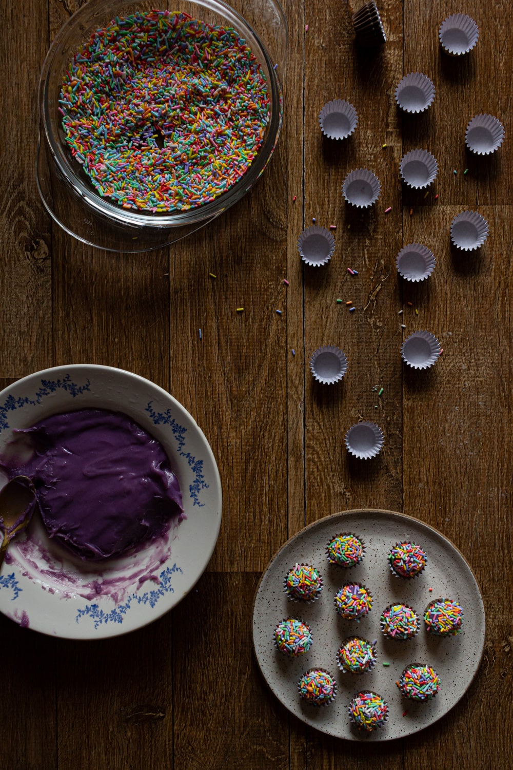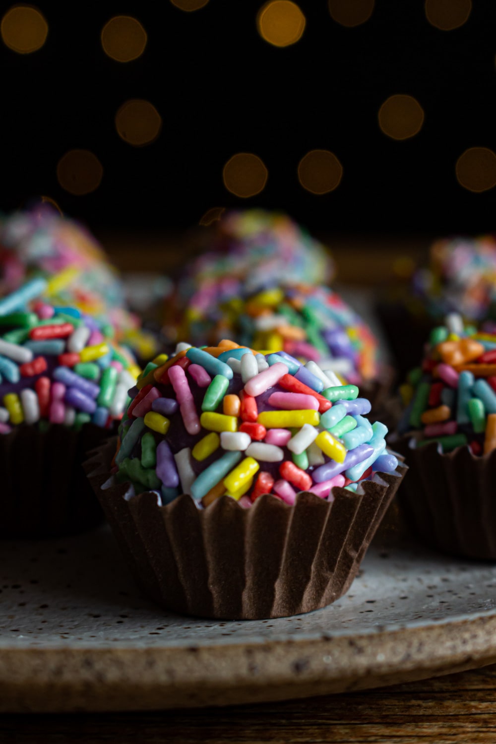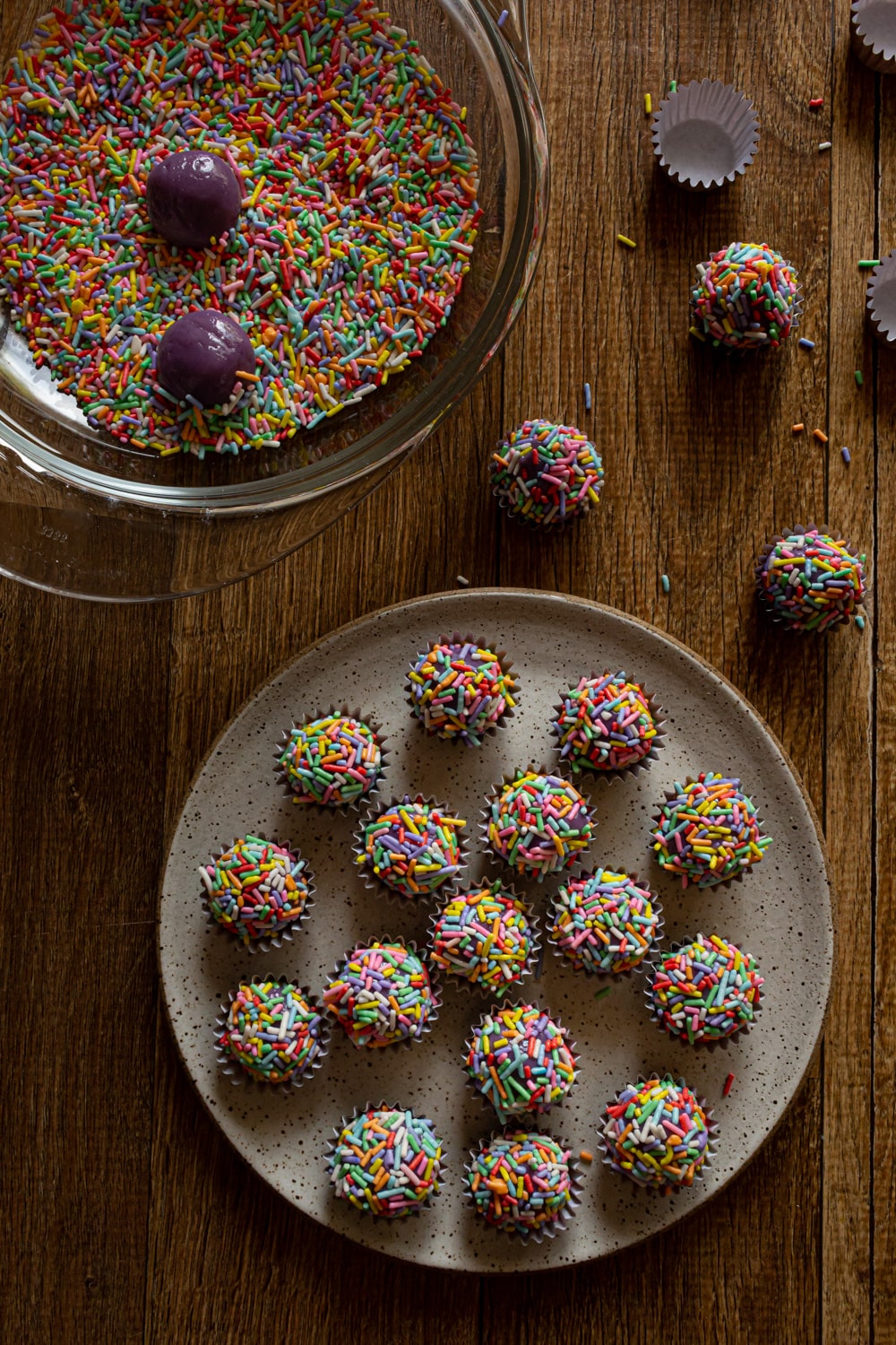 - Junte todos os ingredientes em uma panela e leve ao fogo médio mexendo constantemente enquanto cozinha.Rapidamente o doce começará a solar da panela. Desligue o fogo e transfira para um prato untado. Deixe esfriar totalmente antes de enrolar e cobrir com o confeito escolhido.