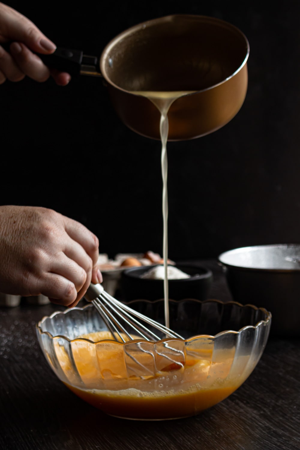 - Junte os ovos e as gemas em uma vasilha e bata até ficar homogêneo. Ainda batendo comece a juntar a cada, aos poucos.Não precisa ser num fio contínuo, mas junte aos poucos para não acrescentar uma quantidade grande de líquido quente nos ovos.