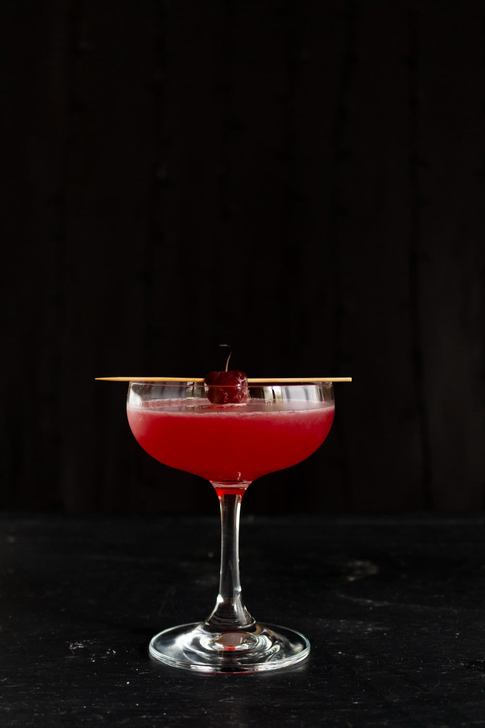 Bata todos os ingredientes com bastante gelo em uma coqueteleira, coe em uma taça rasa e sirva com uma cereja.