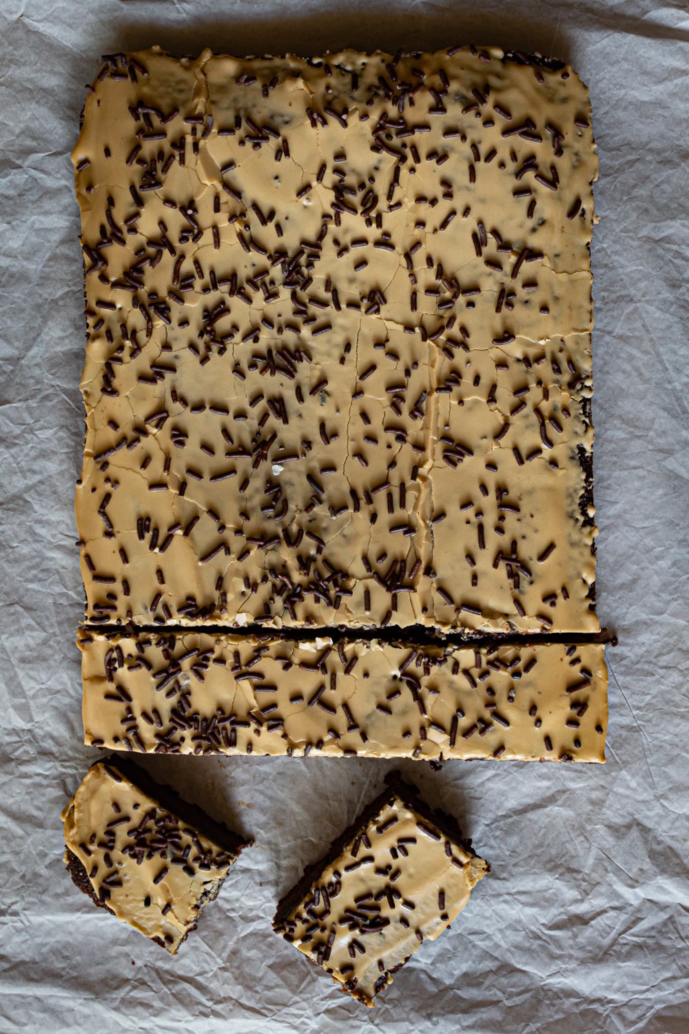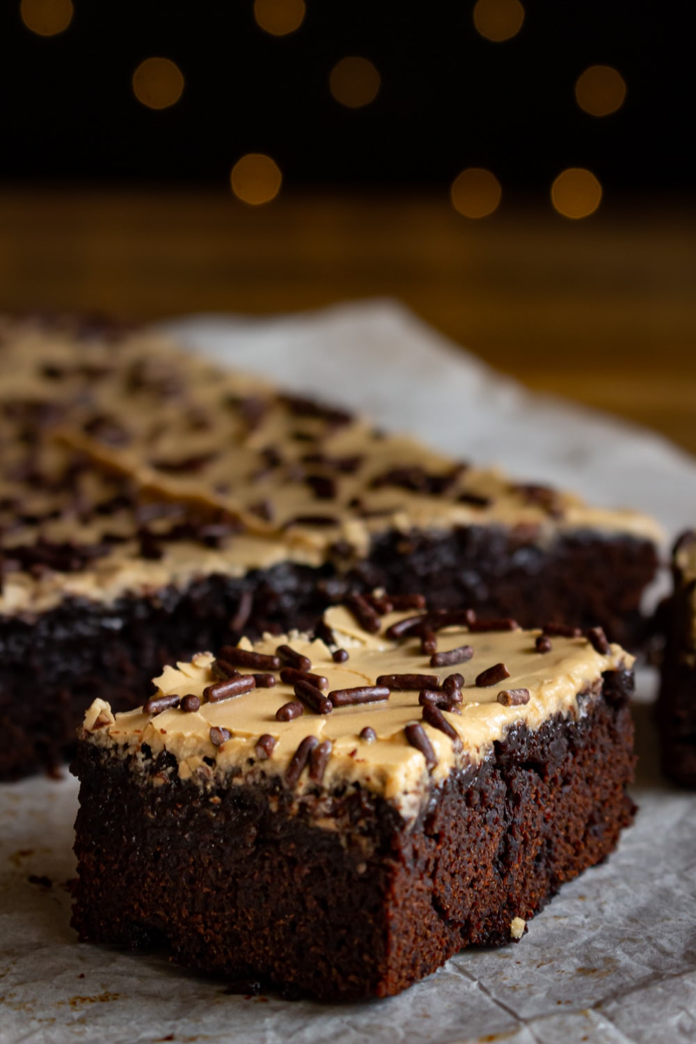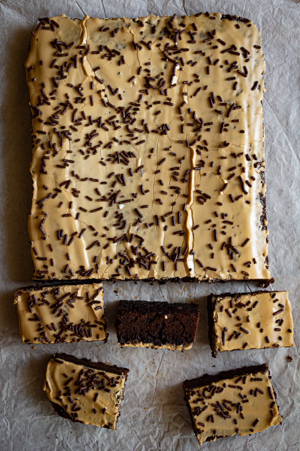 - Junte o expresso, aos poucos, ao açúcar de confeiteiro até conseguir um glacê da textura desejada. Espalhe sobre o brownie já frio e finaliza com alguns granulados de chocolate.
