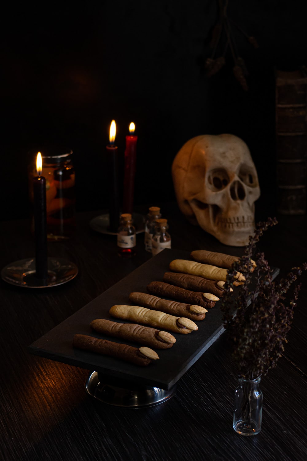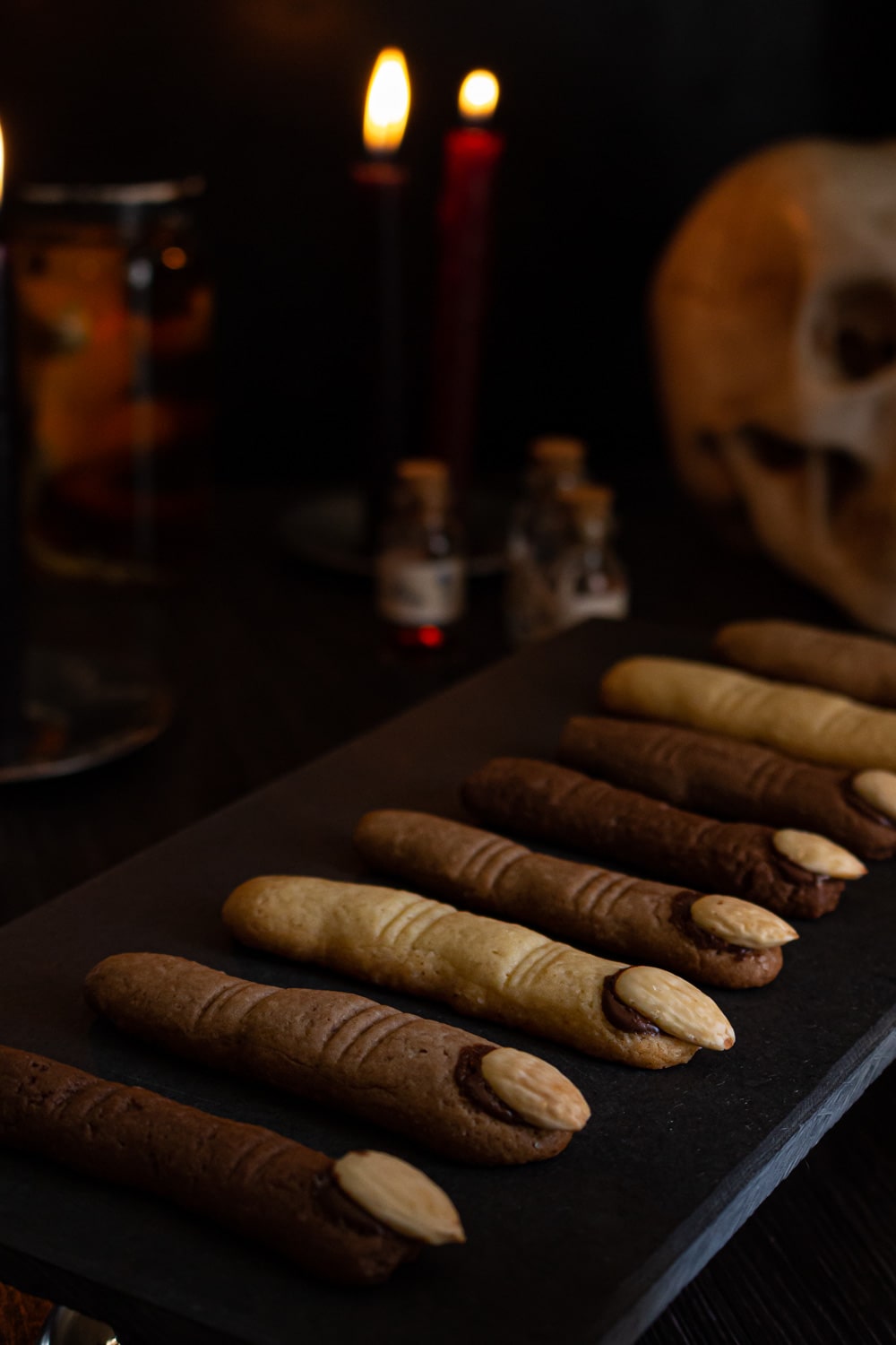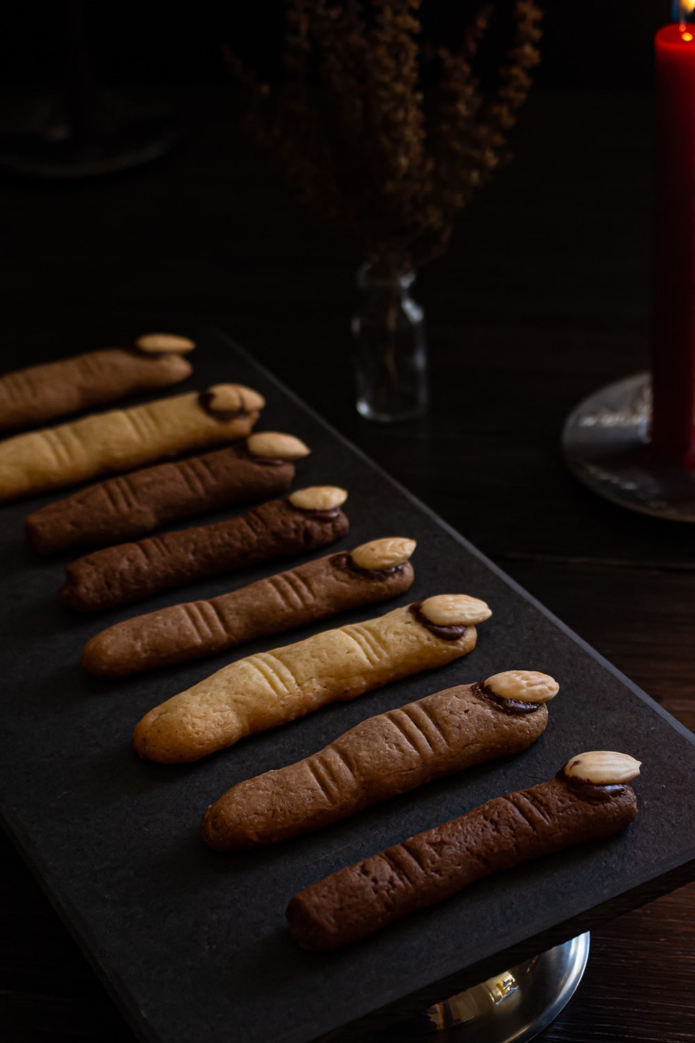 Por último, eu sinto falta de dar opções veganas de biscoito. E ainda não tenho nenhuma opção de massa de biscoito vegana que seja modelável o bastante pra fazer esses dedos de bruxa. Então se você conhecer alguma receita assim, poderia me indicar? Eu vou adorar ter mais uma opção!