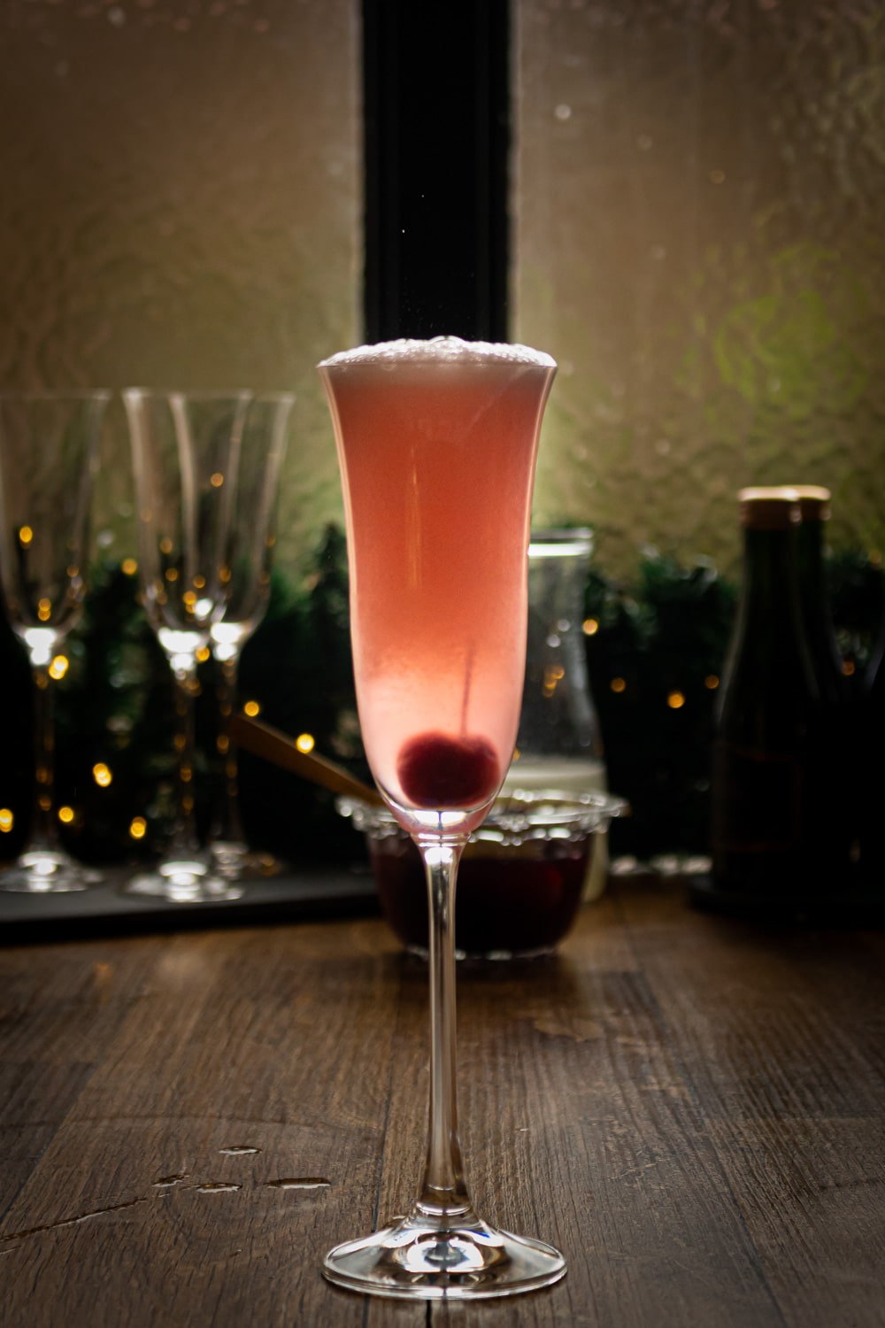 Bata as medidas acima de rum, limão e xarope em uma coqueteleira cheia de gelo até gelar tudo. Coe essa mistura para retirar as pedras de gelo e evitar a diluição do drink. Sirva um pouco da calda da cereja em uma taça comprida, junto com uma cereja. Cubra com a mistura da coqueteleira até metade da taça e complete com o espumante.