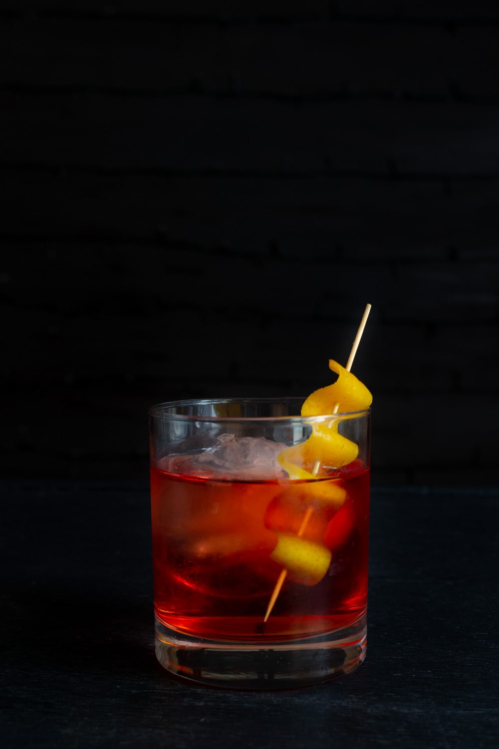 Atualização: em 2020 refiz esse drink para gravar um vídeo e acabei atualizando a foto desse post também. Não mexi na receita, apenas na apresentação: usei uma única pedra de gelo grande na hora de servir e servi a casca de laranja ondulada em um palito.
