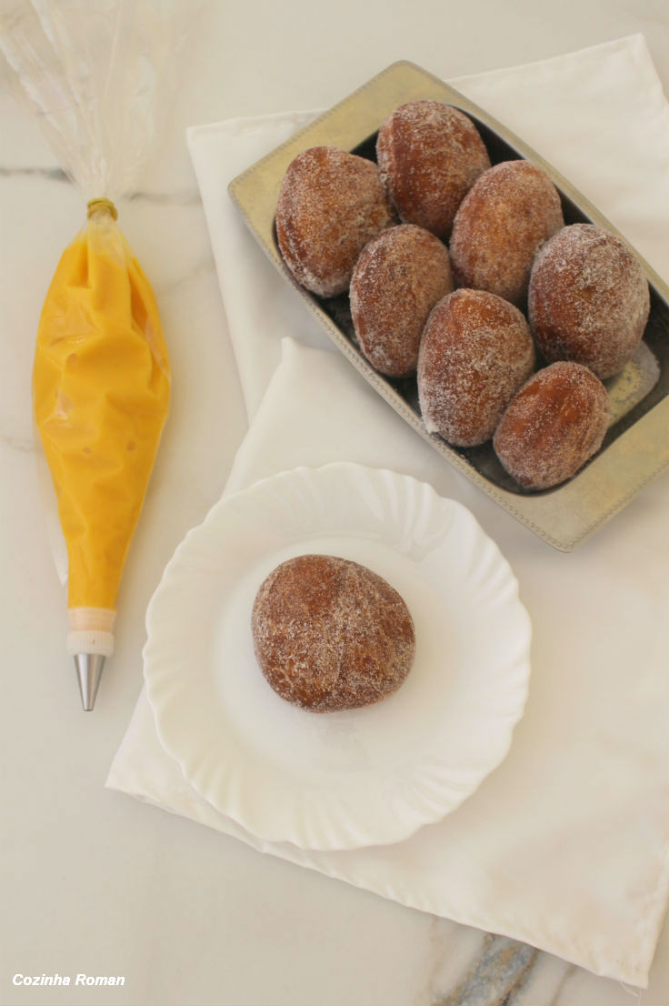 Aqueça uma panela com óleo e frite os donuts até que dourem ligeiramente. Você pode retirar da fritura e deixar escorrer sobre papel toalha, ou usar uma peneira de metal, sendo que com a peneira eles ficam mais sequinhos. Passe os donuts ainda mornos no açúcar e eles estão prontos para serem recheados. Você pode cortar e espalhar o recheio em uma banda, igual aos sonhos de padaria. Ou pode usar um saco de confeiteiro para rechear o donut sem abrir. Se você tiver aqueles bicos próprios para rechear, que são longos e fininhos, melhor ainda! Mas eu usei um bico pitanga simples mesmo e deu tudo certo.