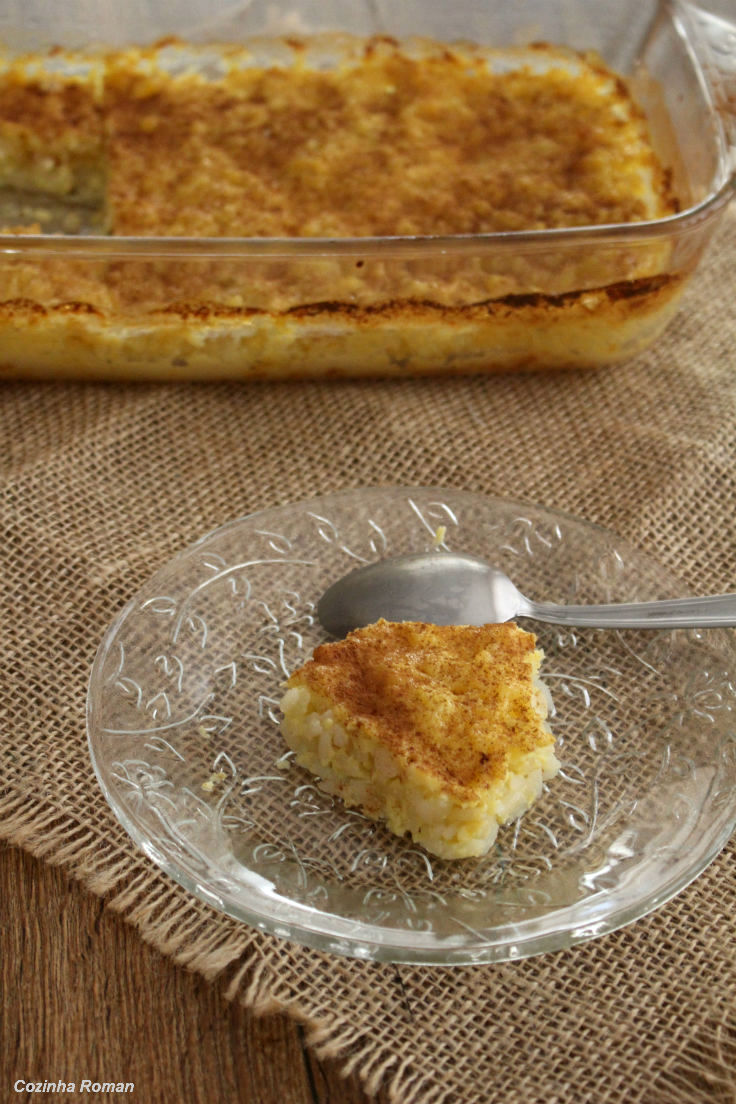 Arroz doce de forno, bem diferente do arroz doce comum que a gente vê todo inverno, mas ainda assim com um toque muito familiar.