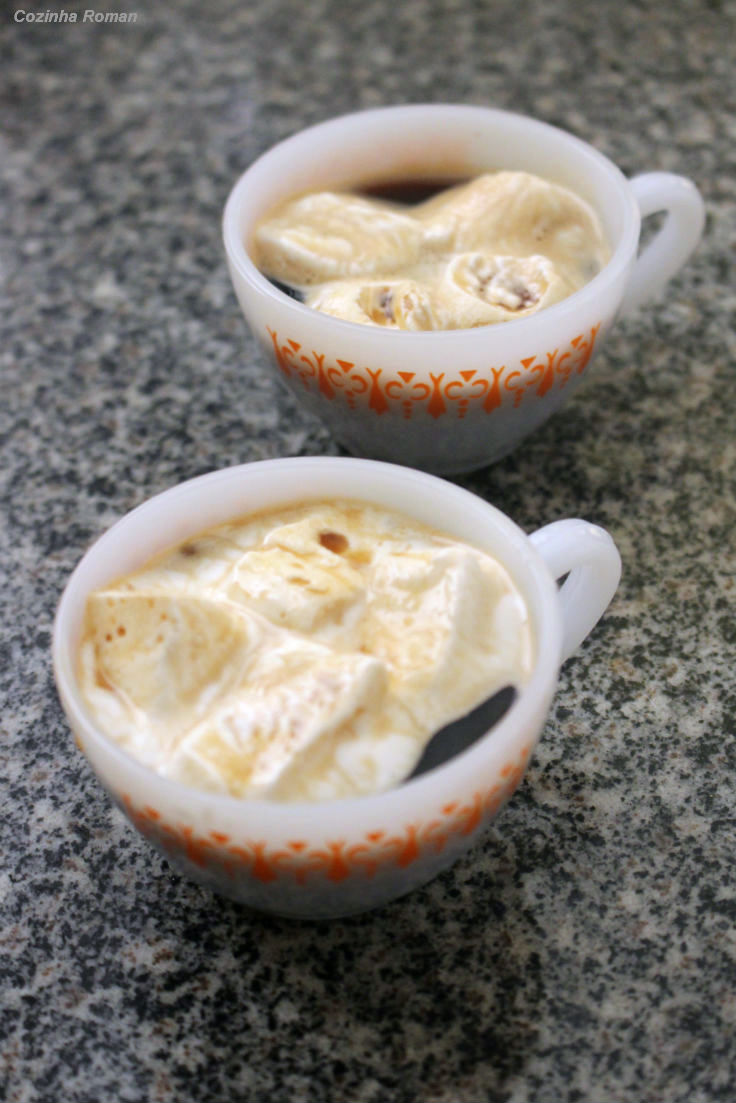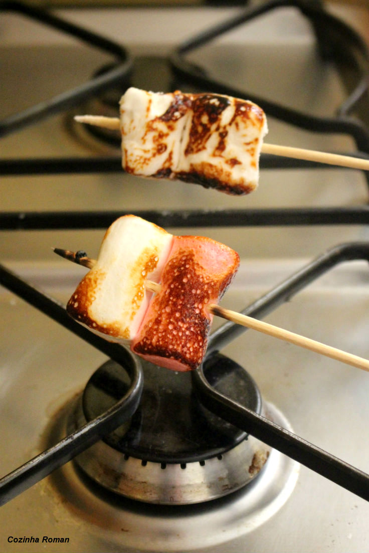 Agora as comparações! Fiz duas preparações básicas com marshmallow: tostados no fogo e sobre o café quente. Ambas foram feitas com o marshmallow caseiro e com o industrializado mais comum por aqui: marca Fini, tipo tubo, pacote com brancos e rosas, os mesmos que usei no choconhaque quente branco.