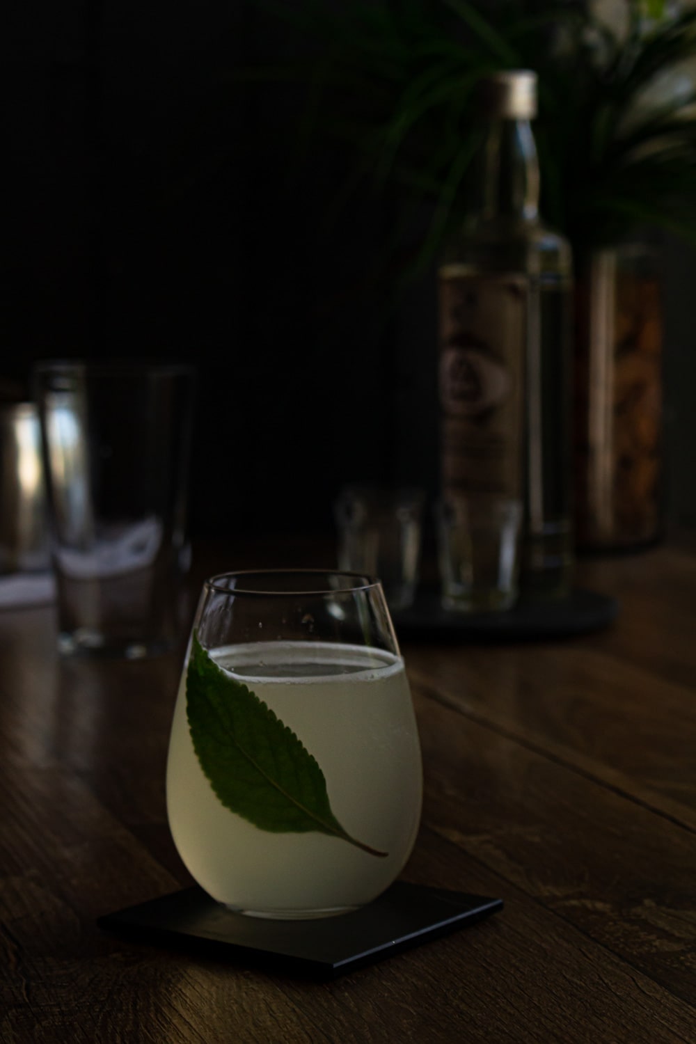 Junte todos os ingredientes em uma coqueteleira com gelo e bata bem. Quando estiver gelado sirva em um copo baixo com uma folha de alfavaca.