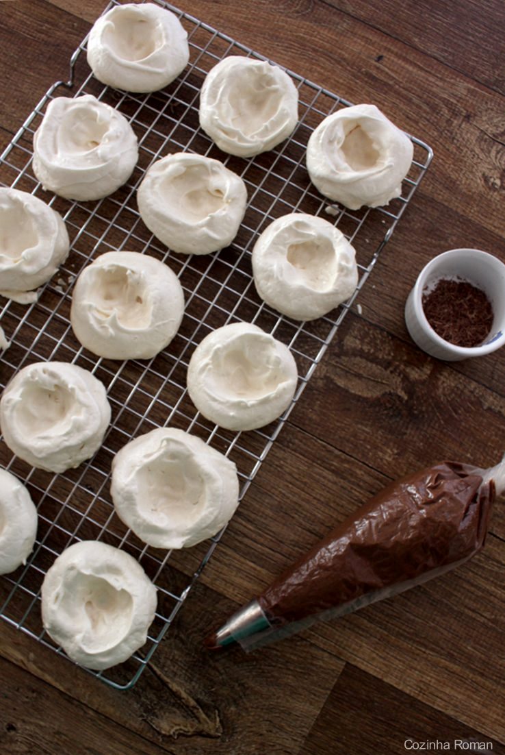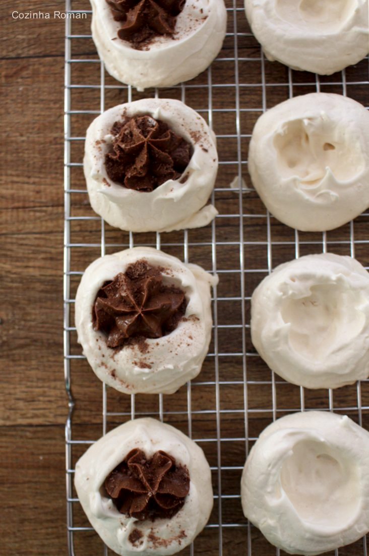 Recheie os suspiros com o creme mocha e finalize como preferir; eu usei raspas de chocolate. Mas monte suas pavlovas apenas na hora de servir, ou logo antes. Quando guardadas recheadas elas acabam derretendo, suspiro inclusive.