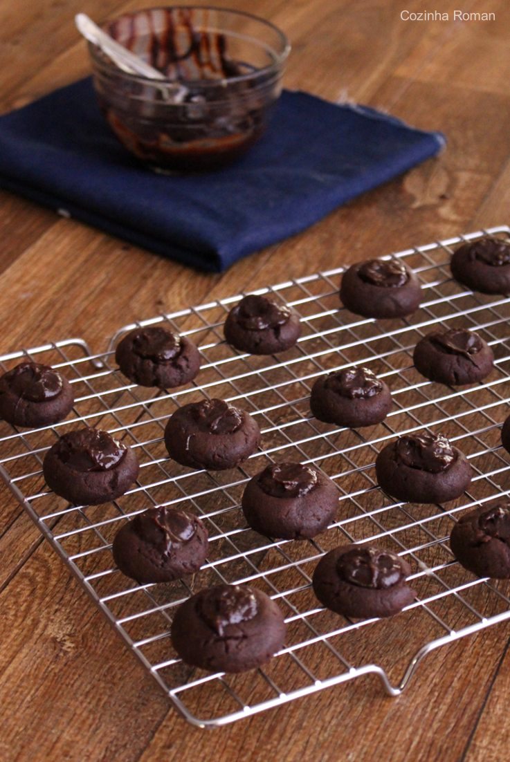 Não é regra mas, se a massa estiver muito mole deixe 15 minutos na geladeira que fica mais fácil modelar. E pra modelar faça pequenas bolinhas, do tamanho de brigadeiros ou um pouco menores. Com o cabo de uma colher de pau, ou seu dedo, faça cavidades no centro de cada biscoito. Leve ao forno, aquecido a 180C, por cerca de 15min, ou até que assem completamente. Espere esfriar antes de rechear.