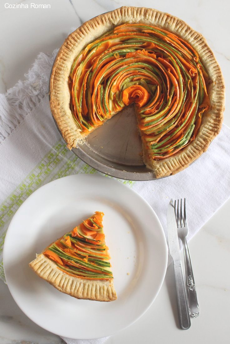 Essa torta foi inspirada na Torta Ratatouille, que usa a mesma técnica mas tem recheio diferente e massa só parecida. O segredo é fatiar os legumes bem fininhos para que dê pra acompanhar as curvas da forma, e ter paciência pra enfileirar todo mundo nessa espiral. Agora, se não quiser dá pra fazer uma versão mais parecida ainda com a ratatouille original: fatie normalmente, cortando rodelas, e enfileire intercalando os legumes. Se a cenoura for muito fininha ainda dá pra cortar na diagonal pra fica rum resultado mais harmonioso. Tudo questão de gosto.