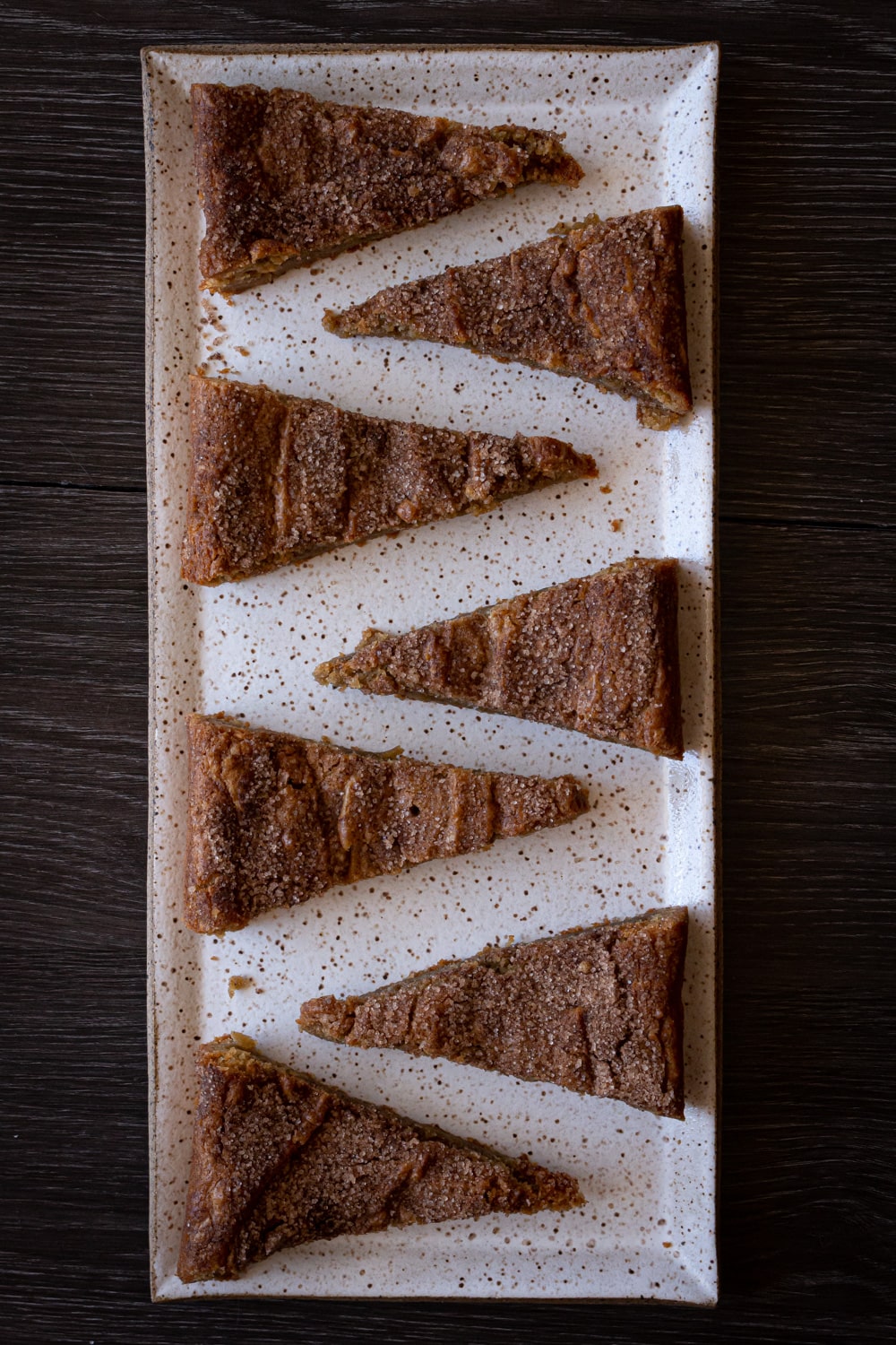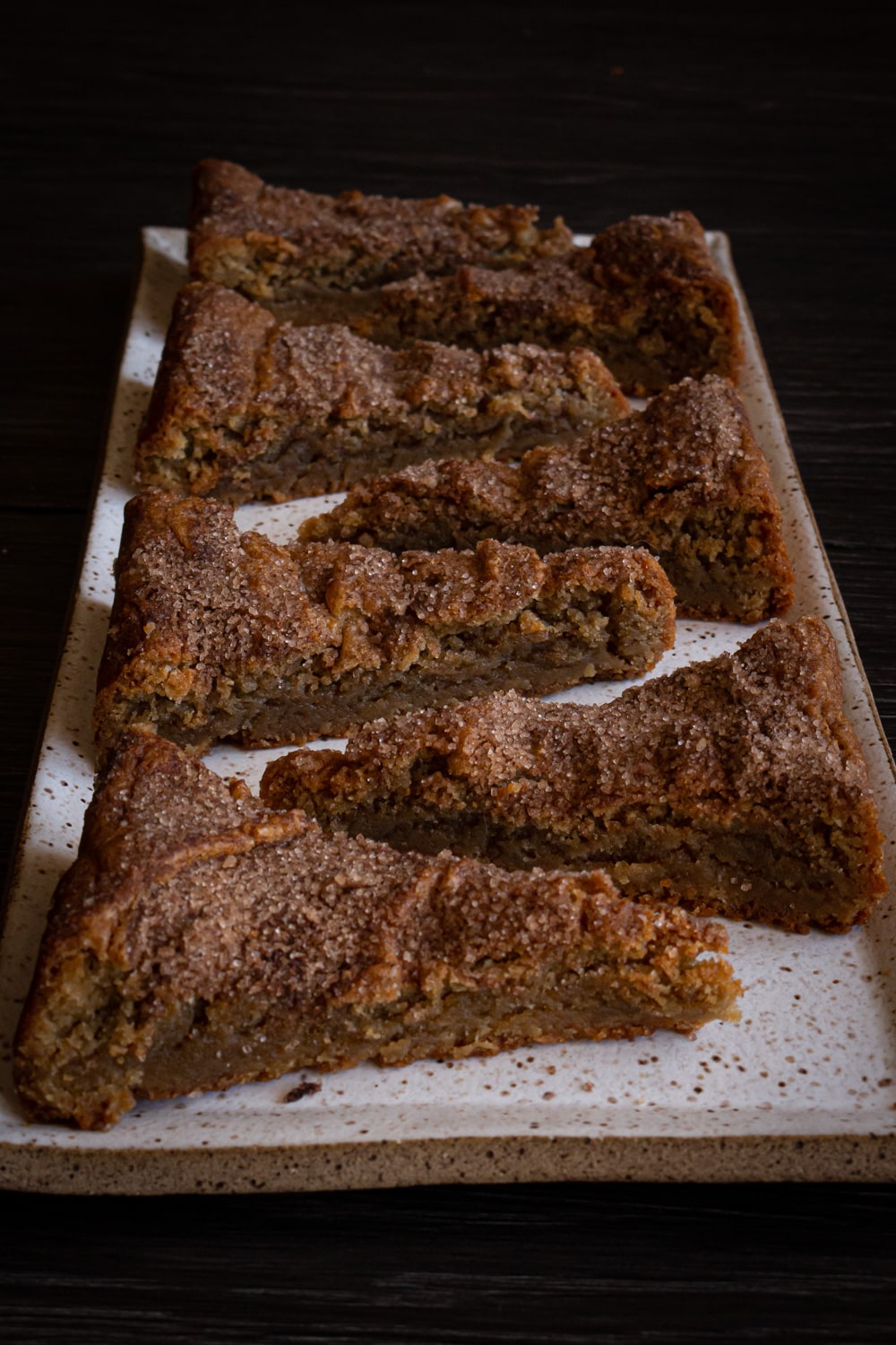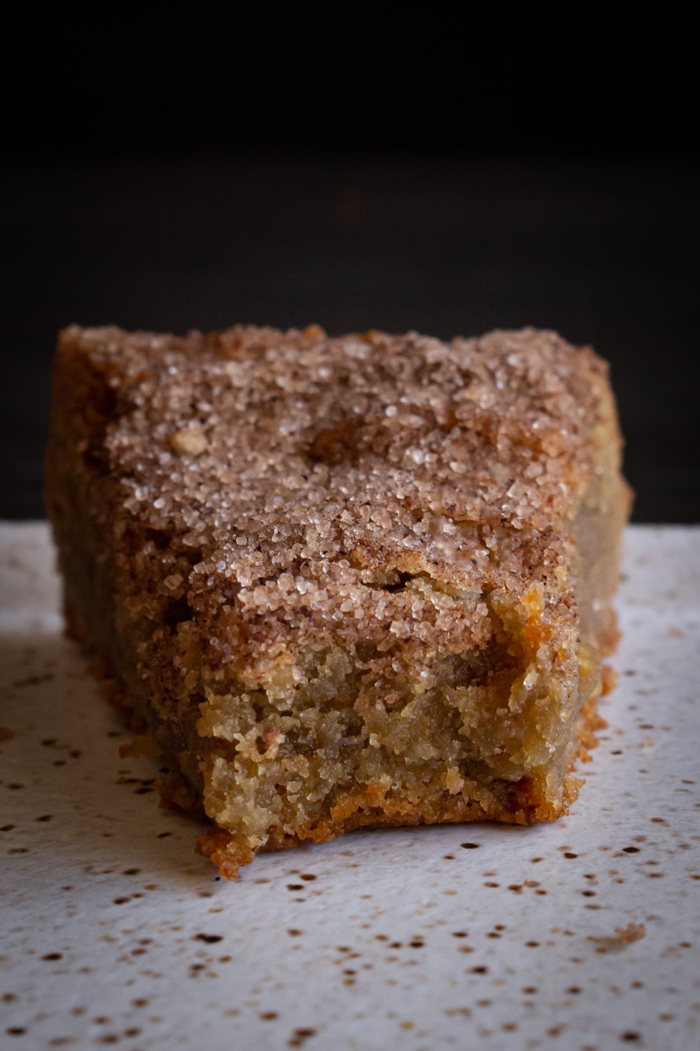 Blondie é um bolo docinho, denso e bem úmido, como um brownie, mas feito sem chocolate misturado na massa. E no caso desse com uma casquinha de canela.