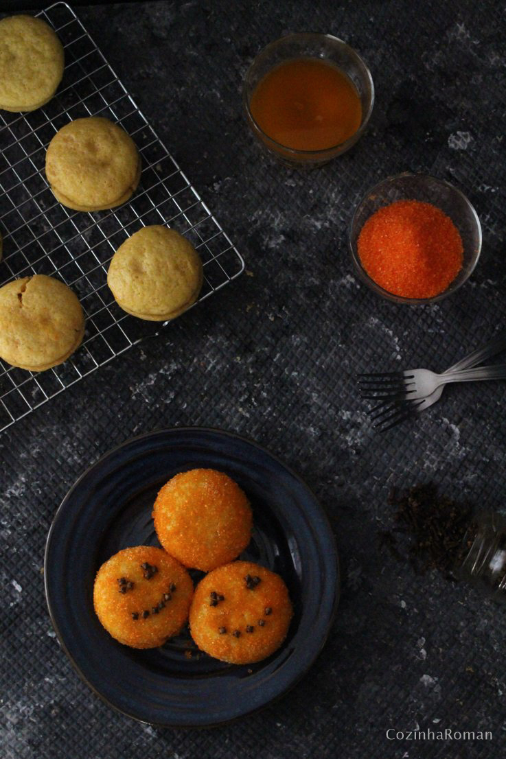 Esses bolinhos era uns cookies de clementines, que são primas irmãs das nossas mexericas candogueiras. Ou tangerinas, a gente já passou por isso em outras receitas né? Só que, quando vi a foto a primeira vez, o que eu enxerguei foram abóboras em miniatura. Fiquei com isso na cabeça agora pro #cozinhadebruxa, e resolvi fazer sim os bolinhos de mexerica, mas com carinha de abóbora. Carinha feita com cravos, porque acho mais prático. Mas que você pode trocar por confeitos se não gostar do aroma de cravo.