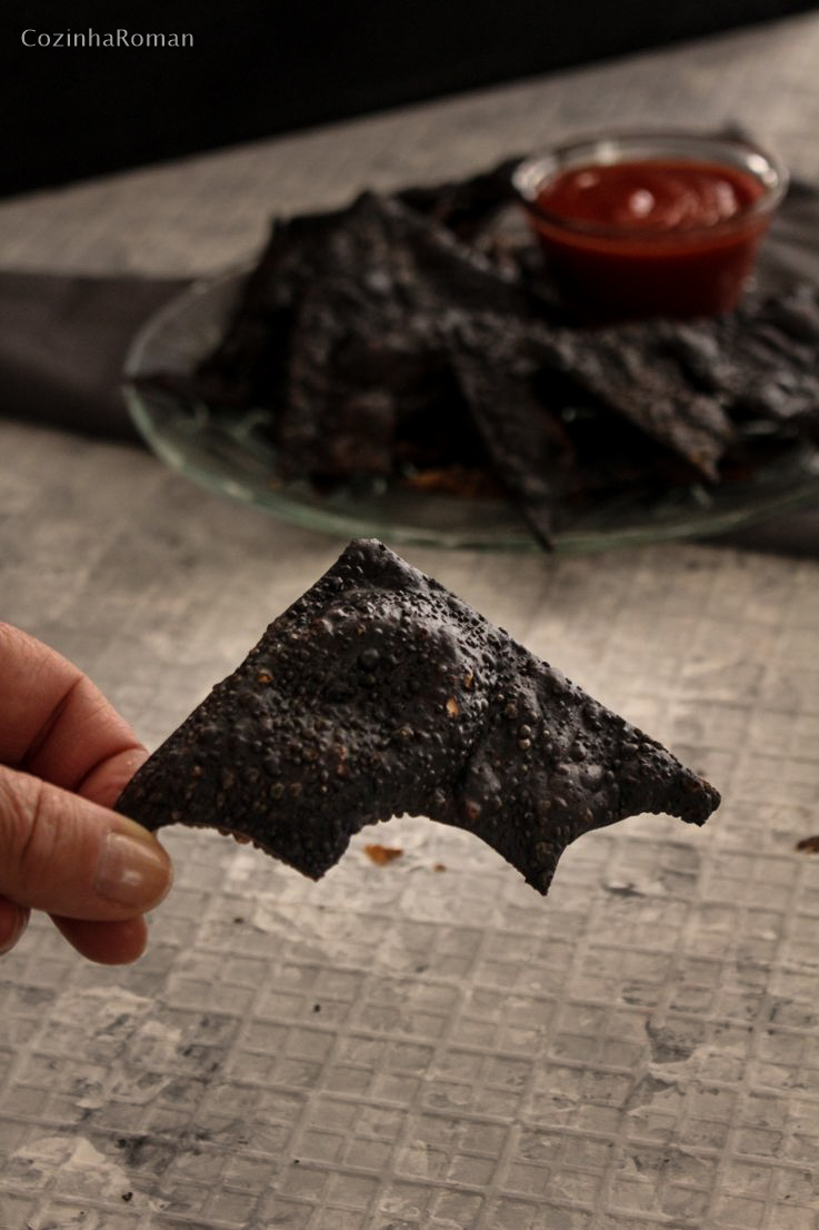 Asas de morcego fritas pra abrir o jantar das bruxas! Ou uma massinha bem crocante e ligeiramente macabra pro seu Halloween!