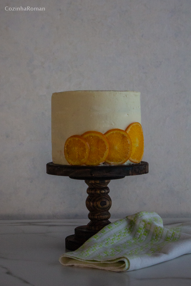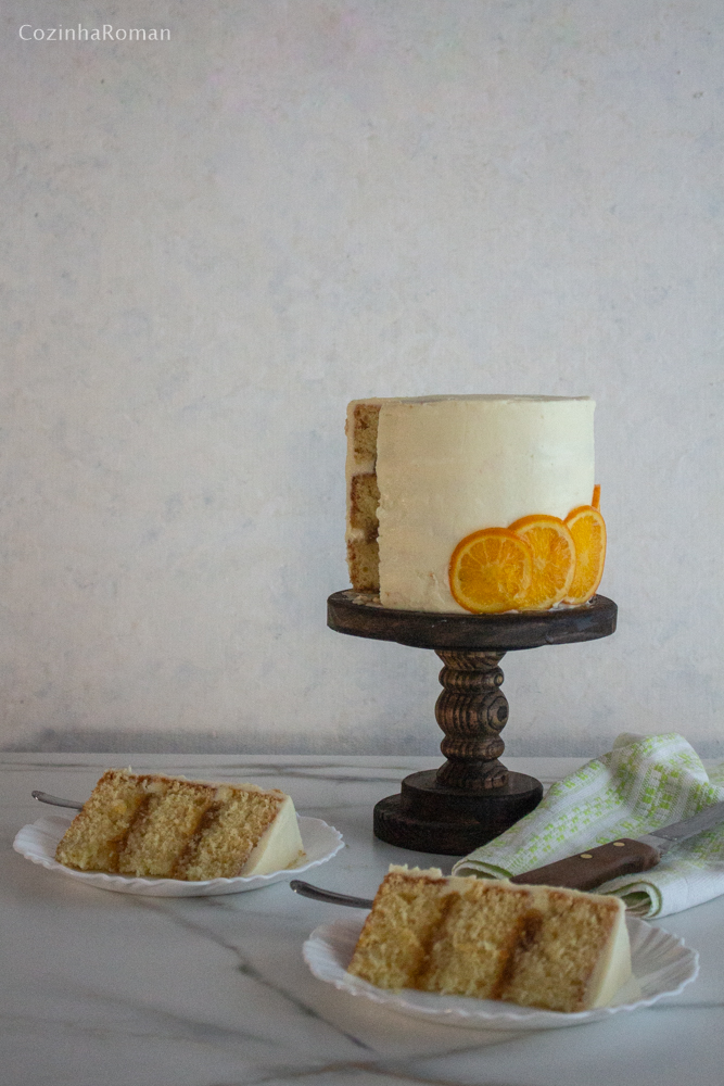 Bolo de laranja com creme de queijo docinho e recheio de geleia de laranja! E sim, ainda tem essas fatias de laranja lindonas pra enfeitar seu bolo.