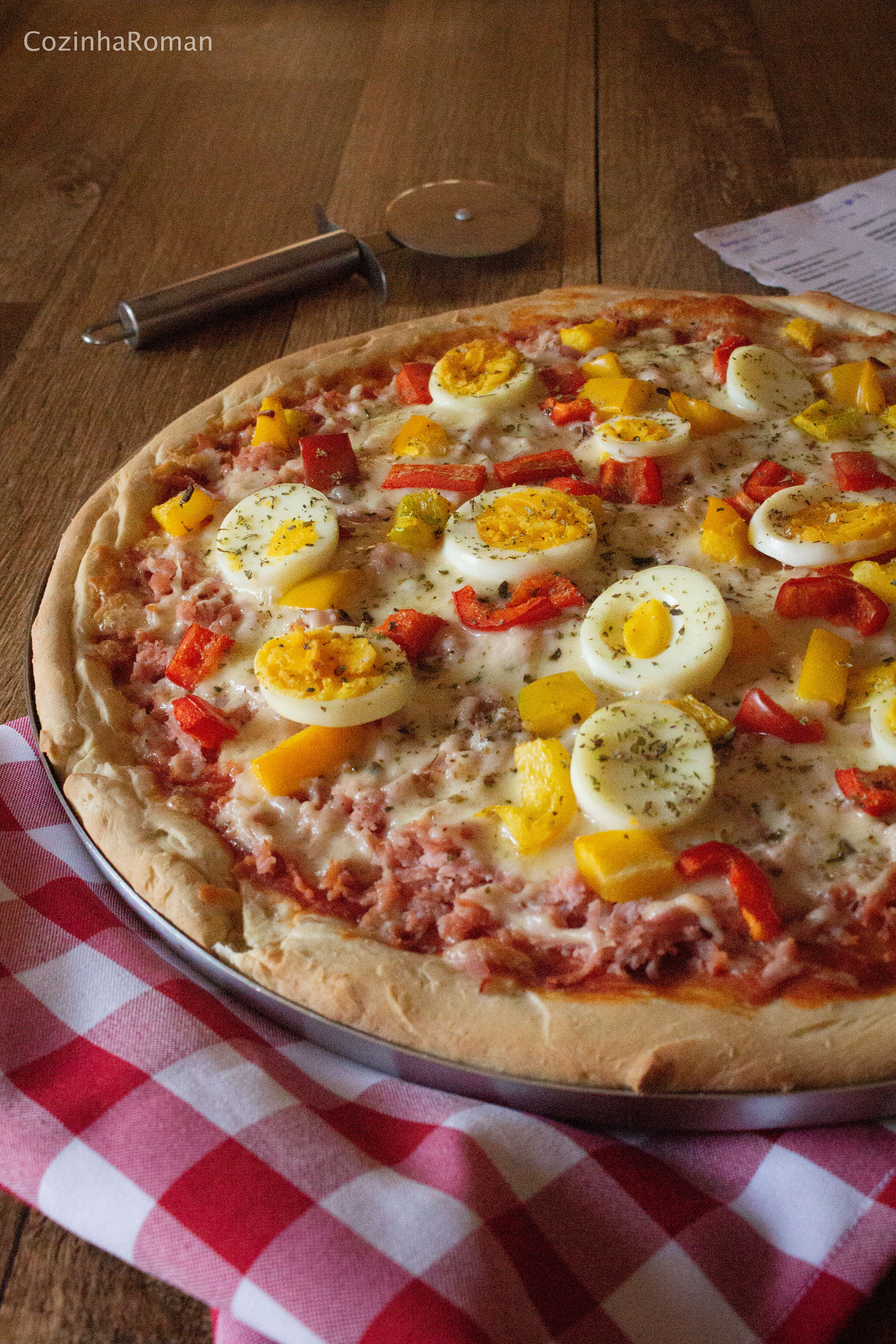 E bota customizado nisso, porque alguém sabe quais os ingredientes oficiais de uma pizza portuguesa? Em cada cidade que morei o sabor tinha uma lista diferente de opções no recheio. Então por aqui resolvemos fazer a portuguesa da casa, com algumas coisas que sempre vi em todas que provei (oi ovo cozido) e sem outros ingredientes não tão queridos na casa.