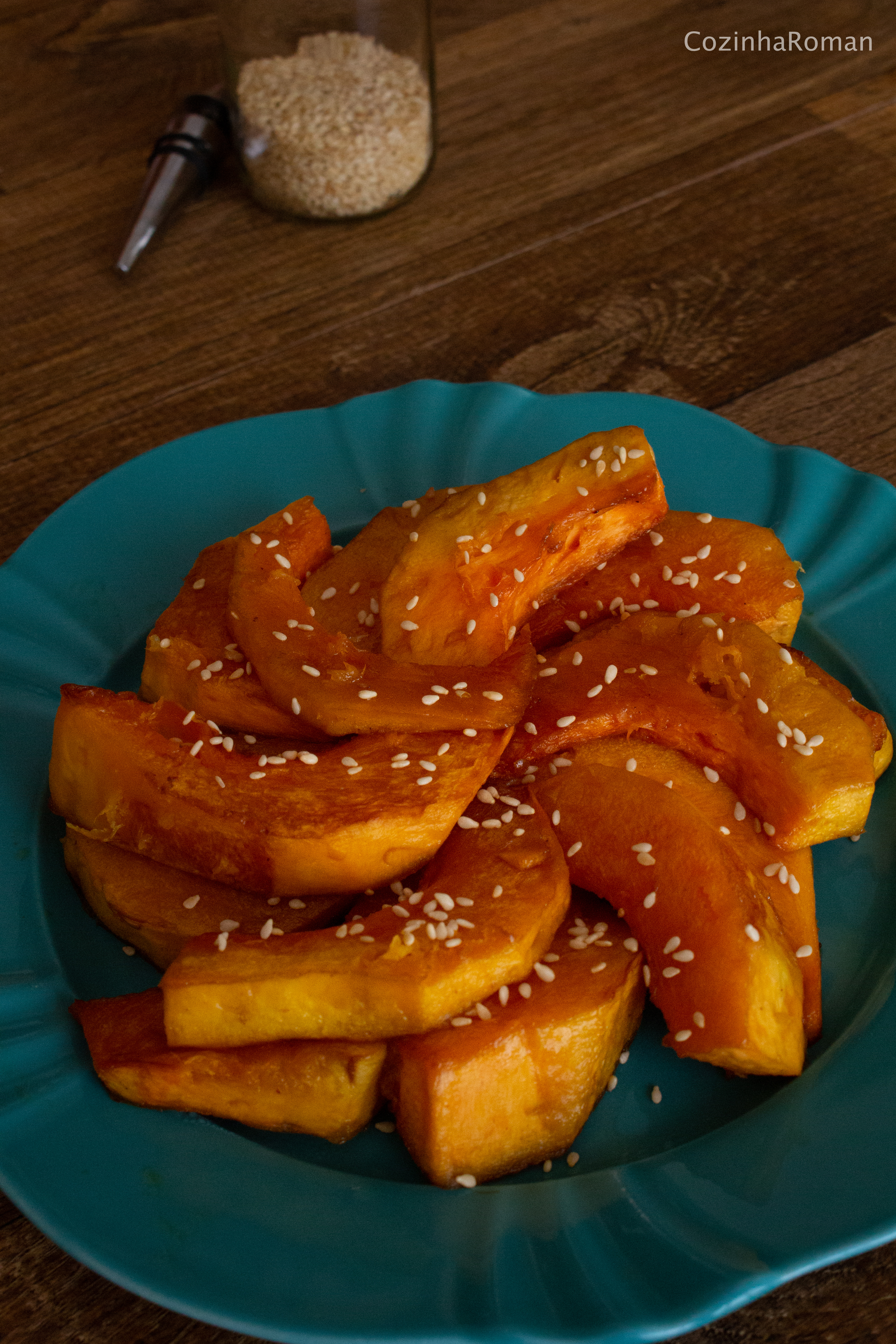 Fatie ou pique a abóbora tomando cuidado para que os pedaços fiquem mais ou menos com a mesma espessura. Misture os outros ingredientes e então misture bem com a abóbora, até que todos os pedaços estejam cobertos com o tempero. Espalhe bem em uma assadeira, sem deixar os pedaços amontoados, e leve ao forno a 200. A cada 20min vire os pedaços, e deixe no forno até que a abóbora esteja macia. Se quiser pode tirar nesse momento. Ou aumente a temperatura do forno e deixe mais uns 10min, ou até que a abóbora doure bem. Sirva com gergelim torrado.