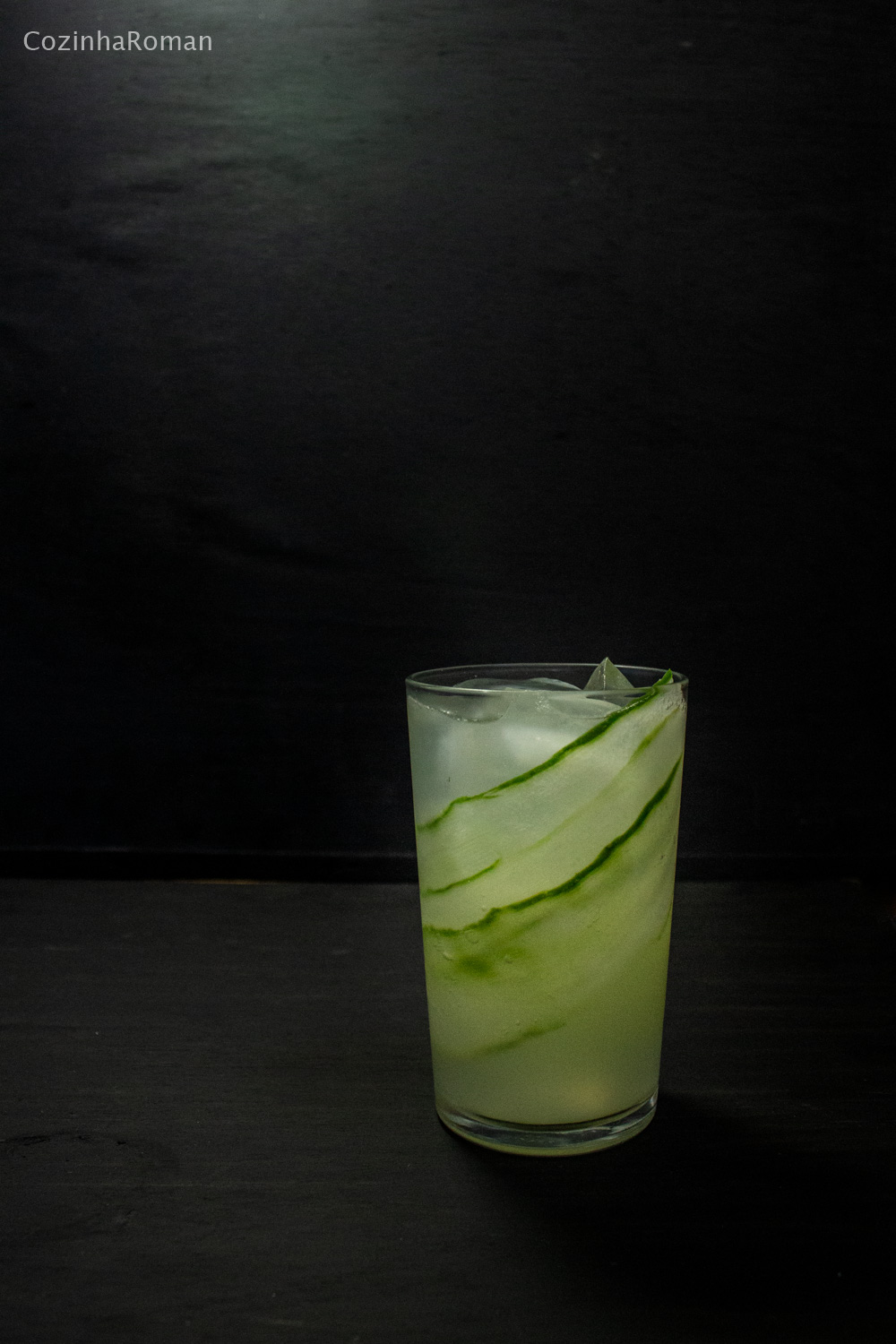 Mas no drink da foto não teve nem metade disso. É que o copo é apenas um copo alto e reto que eu tinha aqui em casa; afinal, não é por falta de copo que vamos ficar sem drink, certo? Já o drink em si virou outra coisa com a adição do pepino: Cucumber Collins, um nome bem descritivo já que cucumber é pepino em inglês. E ele faz uma diferença viu. O sabor fica bem suave, mas a refrescância vai lá em cima! Aconselho todo mundo a provar, mesmo quem não é fã de pepino na salada.