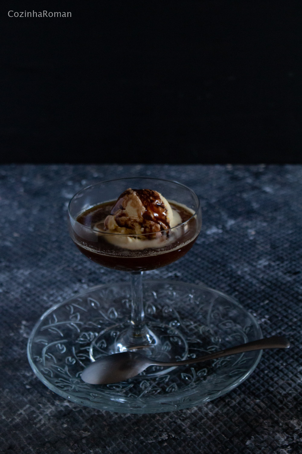 E como esses dois viram martini affogato? Tacando vermute no café, ué! Usei uma taça bonitona, pra fazer essa foto linda, mas serve em qualquer recipiente. Reguei com uma calda de chocolate basicona: chocolate em pó, açúcar e água, em quantidades iguais e no fogo só até ferver. No entanto serve qualquer calda que você tiver… Caramelo, xarope de açúcar, calda de sorvete… Ou nenhuma, caso você não goste de sabores muito doces.