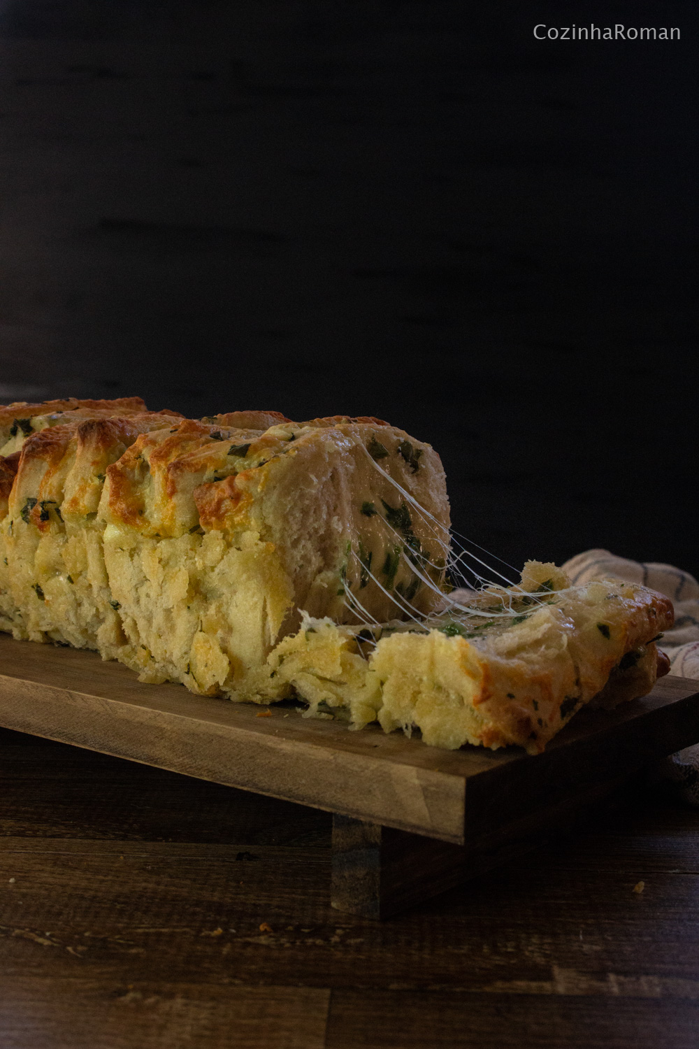 E dito tudo isso, qual o grande tchã desse pão? Queijo, muito queijo. Dá uma olhada nas fotos e confere a teia de queijo que aparece quando a gente puxa uma fatia. Ainda tem a manteiga que garante a separação das camadas, e as ervas que garantem um sabor a mais. E claro, a massa fofinha; daquelas boas com poucos ingredientes mas que crescem bem no forno.