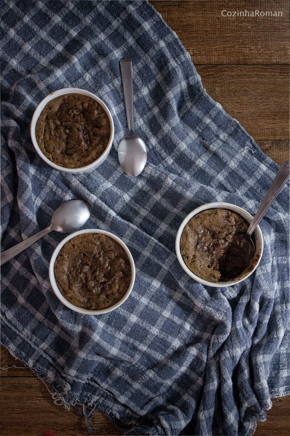 Divida a massa entre 3 ramequins de cerca de 9cm e leve ao forno, a 200C, por cerca de 15min. Sem deixar que a massa seque totalmente. Sirva ainda quentinho.