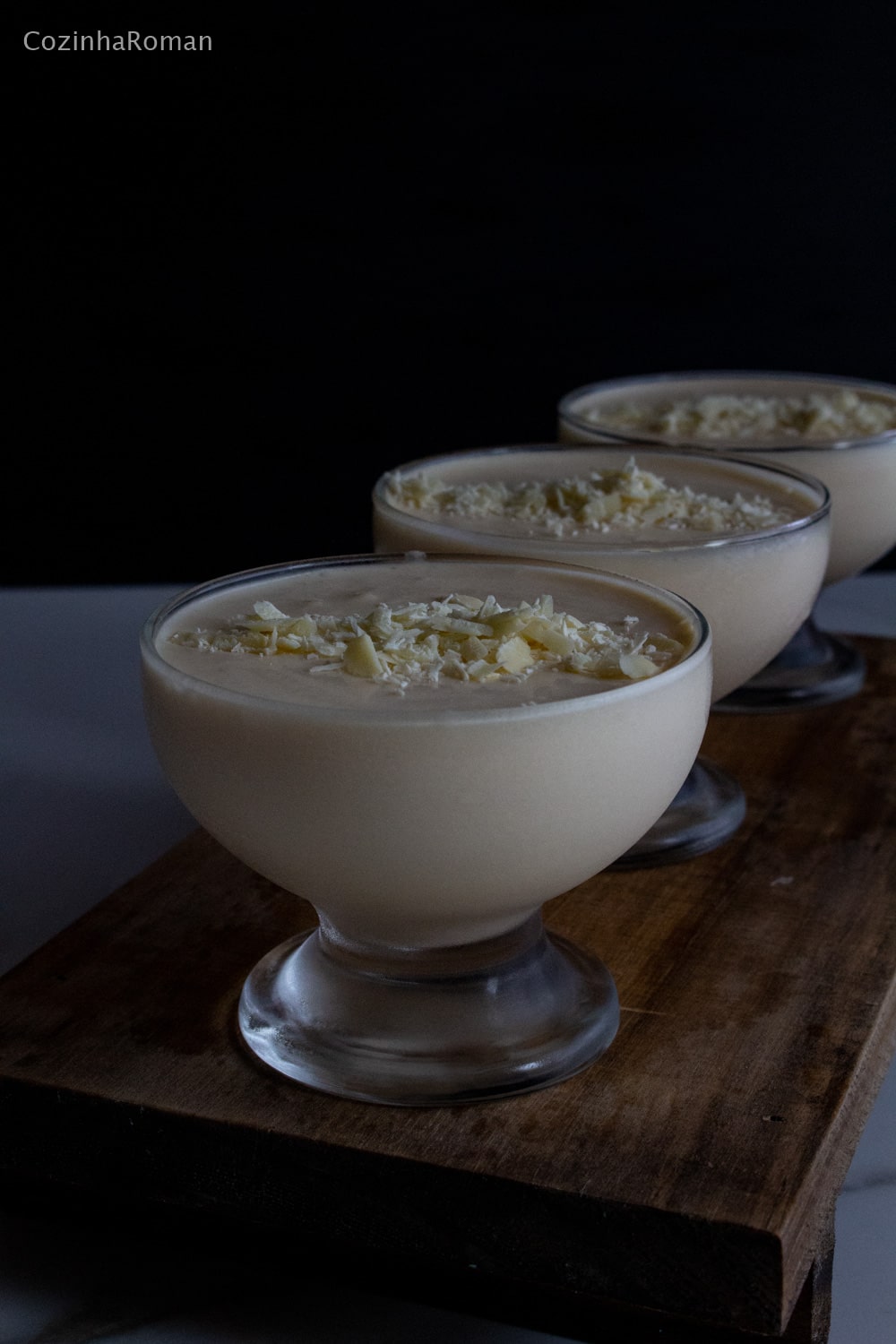 Divida em tacinhas individuais, ou transfira para a tigela onde for servir, e leve para a geladeira por algumas horas. Antes de servir cubra com um pouco de raspas de chocolate branco.