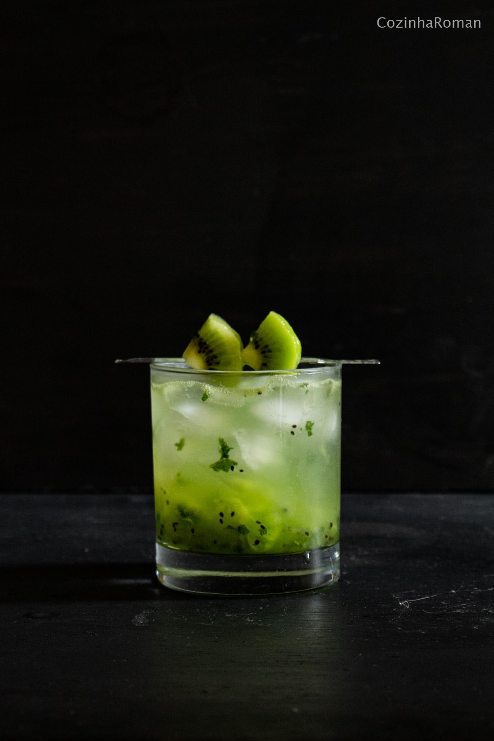 Caipiroska de Kiwi que junta o sabor da fruta in natura com a refrescância da hortelã e do limão; e tem um teco de vodka também pra quem gosta.