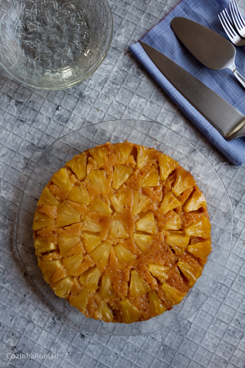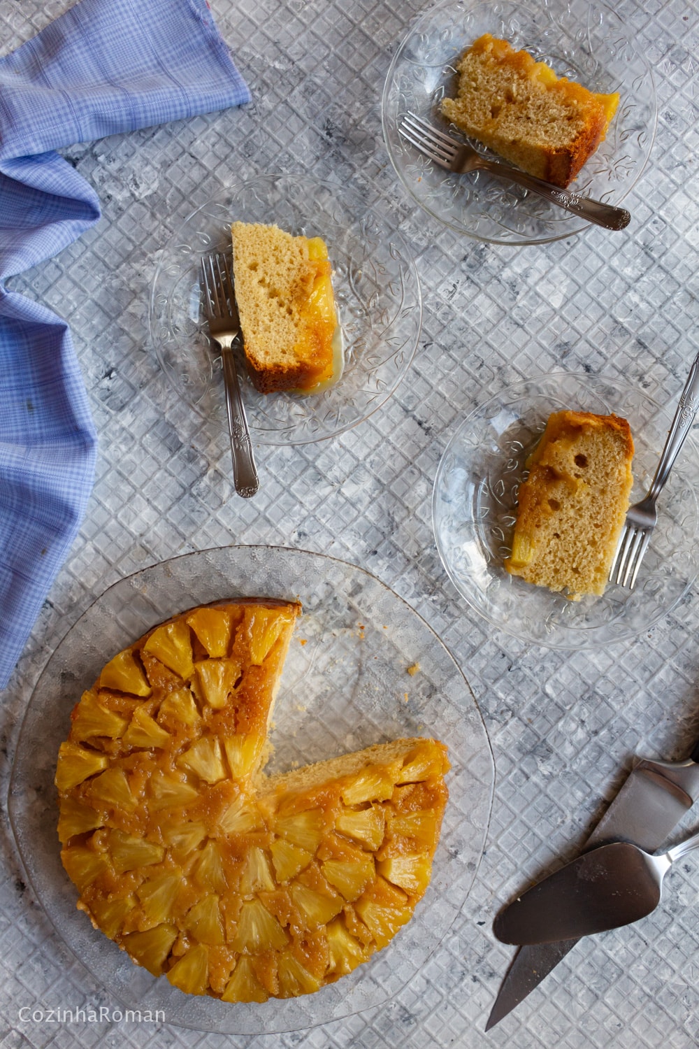 Bolo invertido de abacaxi, daqueles que revelam uma bonita surpresa quando desenformados, que dão medo na hora de fazer e que ficam uma delícia depois de prontos…