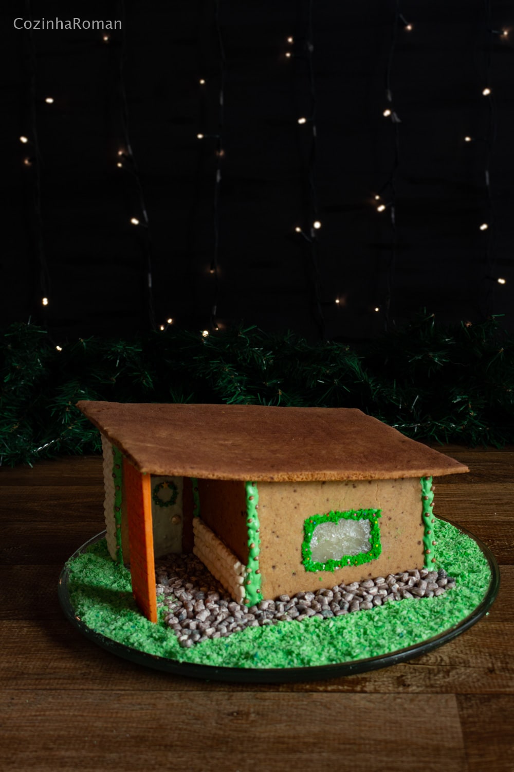Para a porta eu usei chocolate branco derretido dentro da marcação feita no biscoito; a maçaneta foi um mini MM pintado com corante prata; e a guirlanda foi feita com glacê real tingido de verde e algumas miçangas de açúcar.