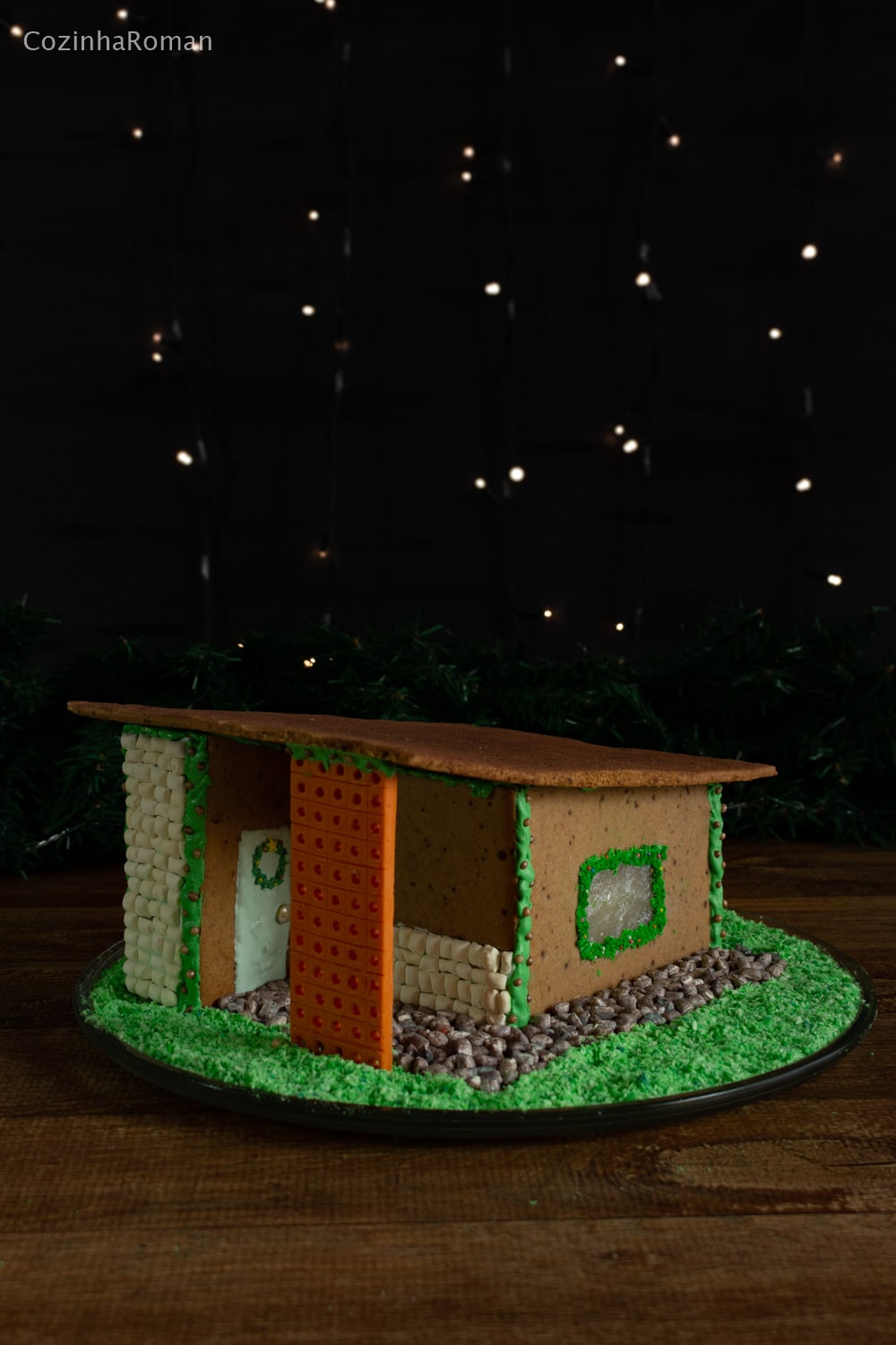 As pedras das paredes foram mini balas delícia coladas com chocolate derretido. A brita são as mesmas balas delícia mas que eu sujei com corante preto. A grama foi feita com coco ralado tingido com corante líquido verde. E o cobogó é uma placa de chocolate tingido de laranja. Para fazer os furos dos cobogós primeiro eu usei uma faca afiada e uma régua para marcar todo o quadriculado; então eu usei um picador de gelo aquecido na boca do fogão para furar o centro de cada quadradinho. E para finalizar eu esfreguei um pouco de chocolate em pó no telhado, para reforçar as marcações feitas com a faca.