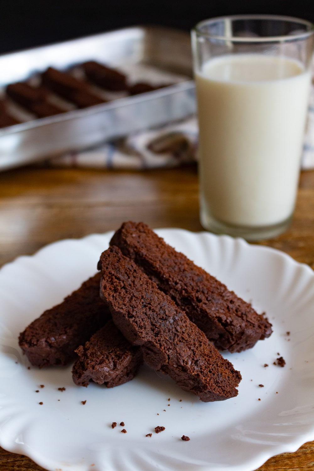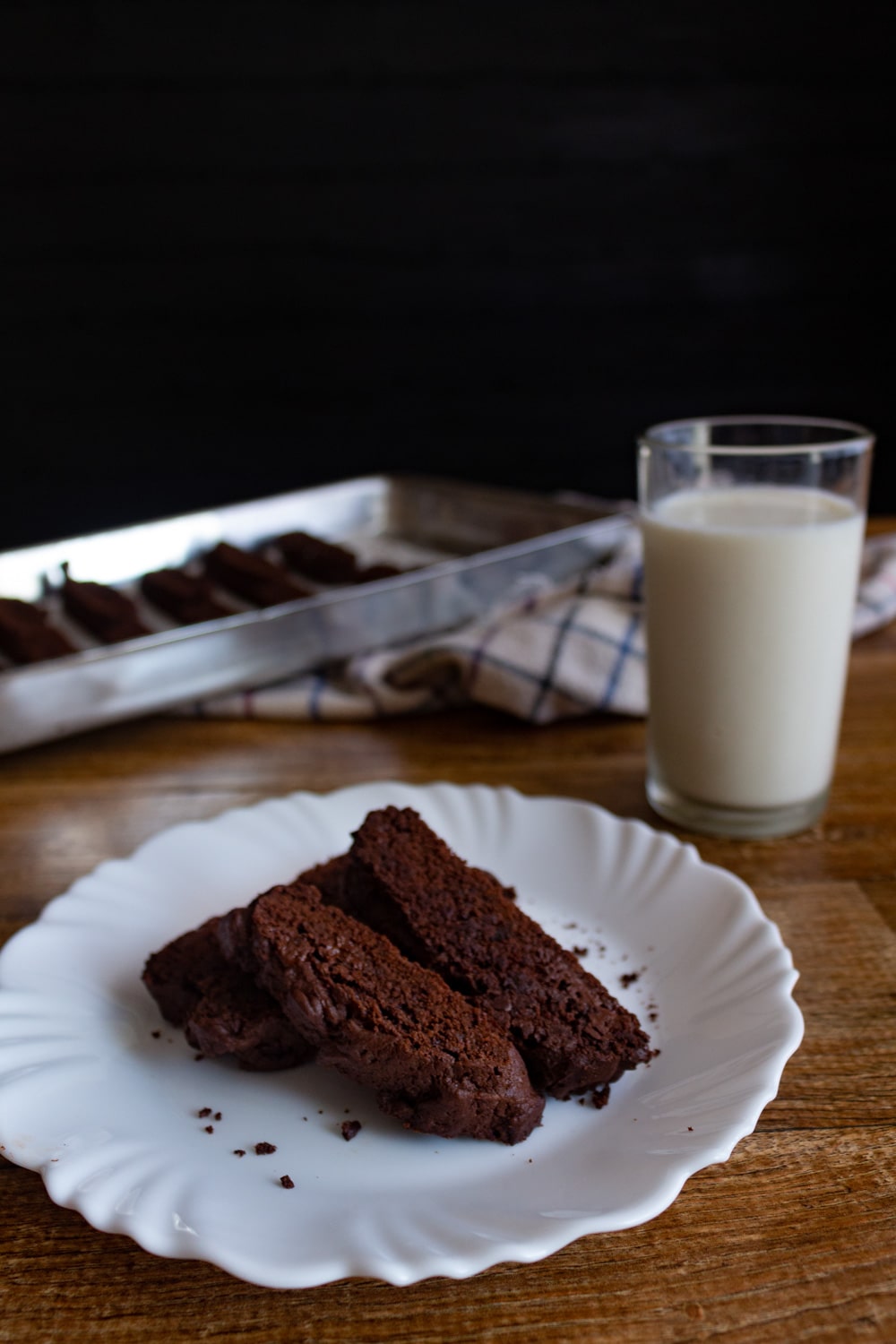Biscotti de Chocolate é um biscoito de chocolate, com pedaços de chocolate, bem crocante, bem fácil, e feito pra durar décadas se guardado em uma lata bem fechada.