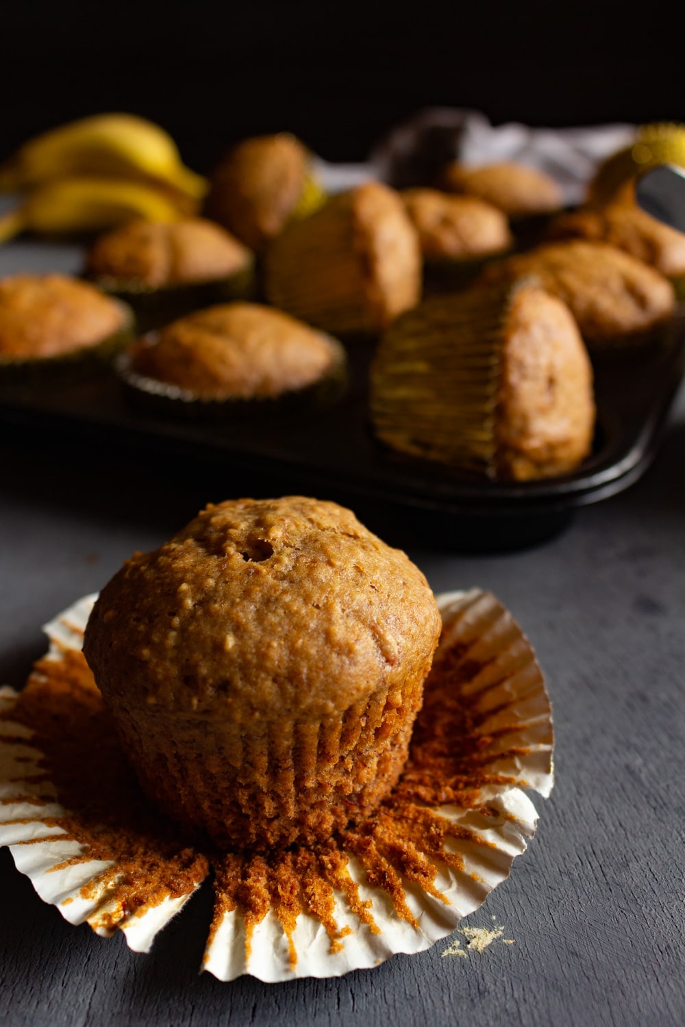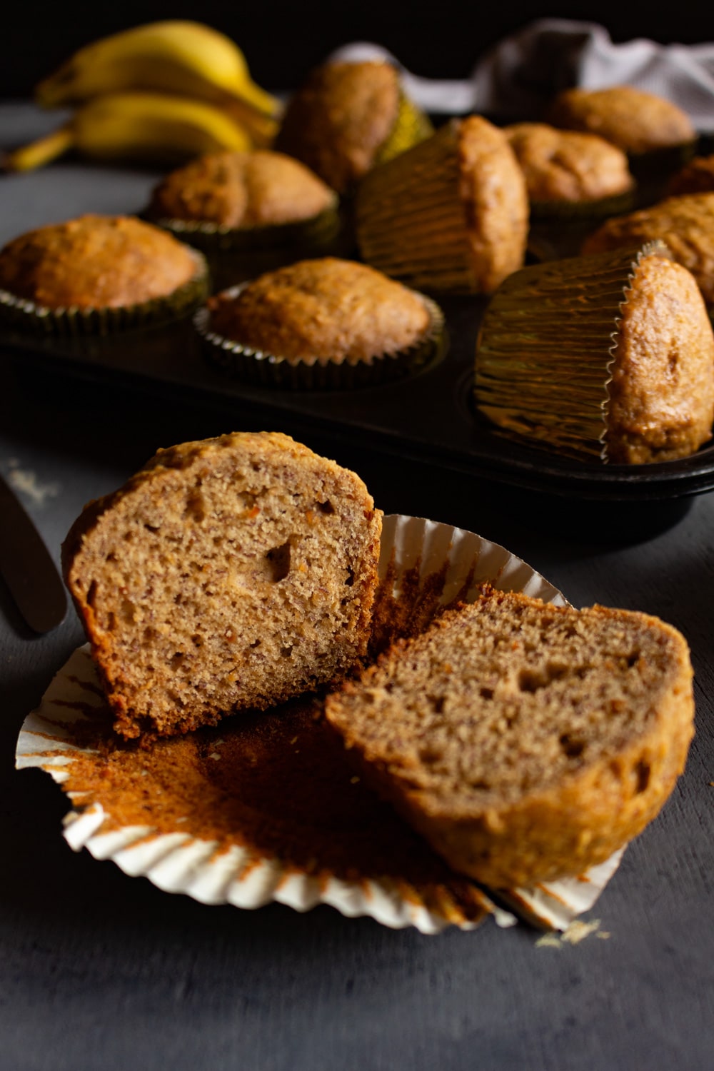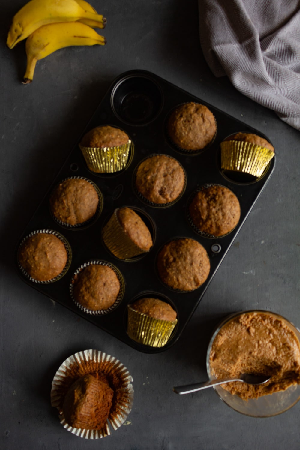 Muffins de banana com pasta de amendoim e mel pra trazer um pouco de conforto e pra deixar o café um pouco mais gostoso.
