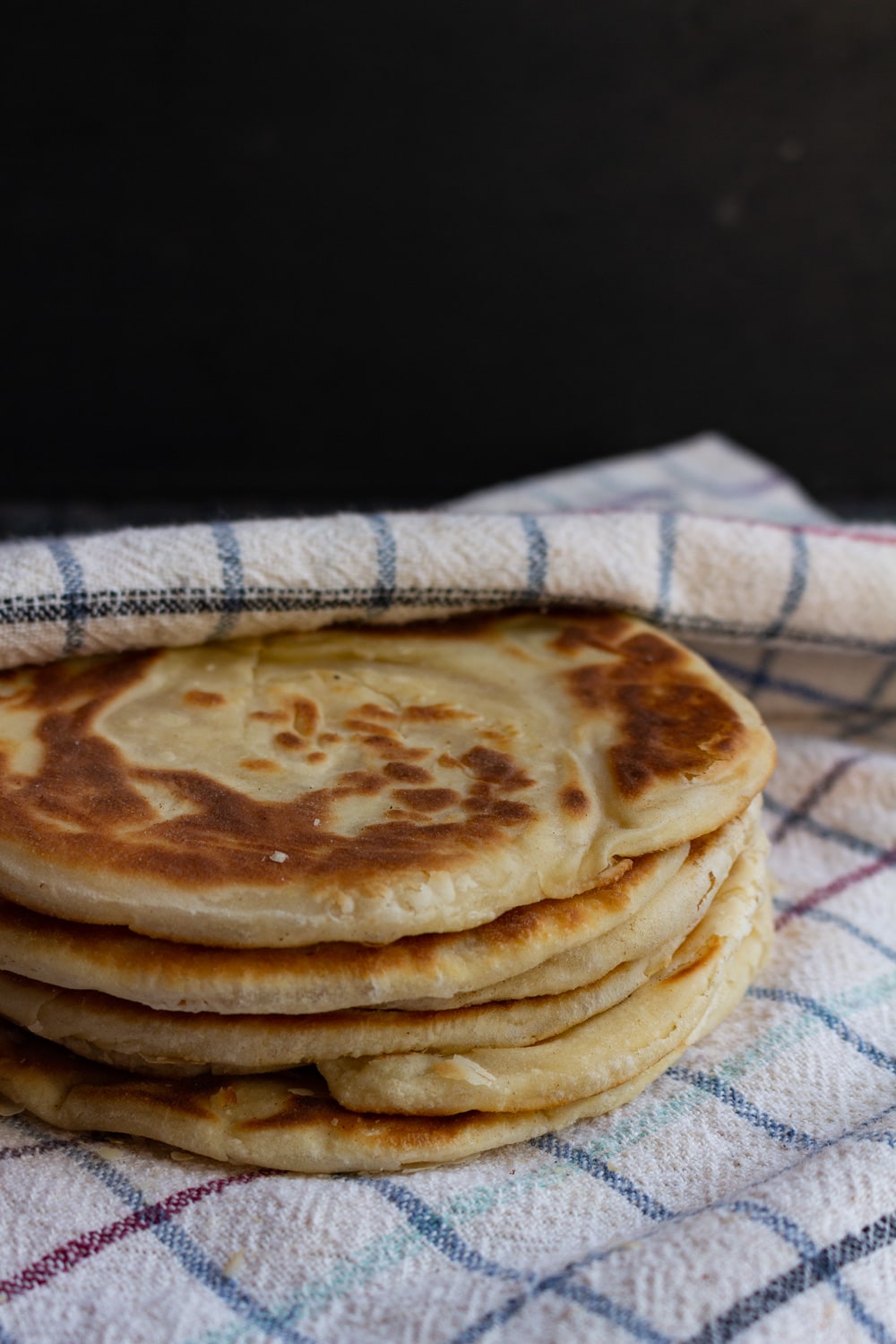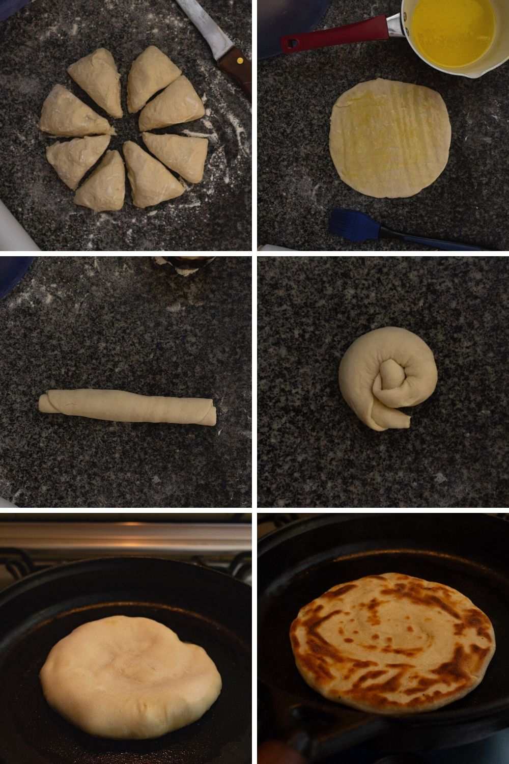 Com um rolo de massa abra a primeira espiral de massa, formando um disco fino de uns 20cm de diâmetro. Pincele um lado com manteiga e coloque esse disco de massa em uma frigideira quente, com o lado com manteiga pra baixo. Ele vai inflar conforme cozinha e depois de alguns minutos vai ter dourado. Pincele o lado de cima com manteiga e vire o pão pra dourar esse outro lado. Depois que os dois lados estiverem dourados tire o pão da frigideira e embrulha no pano de prato dentro do forno, e deixe dentro do forno desligado. Repita com todas as espirais de massa e sirva ainda quentinhos.