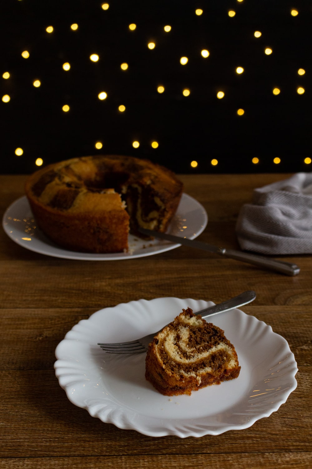 Unte uma forma redonda de furo no meio com óleo, e comece a montar o efeito marmorizado. Pingue um pouco de cada massa na forma, misturando as duas apenas ligeiramente uma na outra. Continue colocando um pouco de cada massa na forma e misturando ligeiramente uma na outra até usar toda a massa.