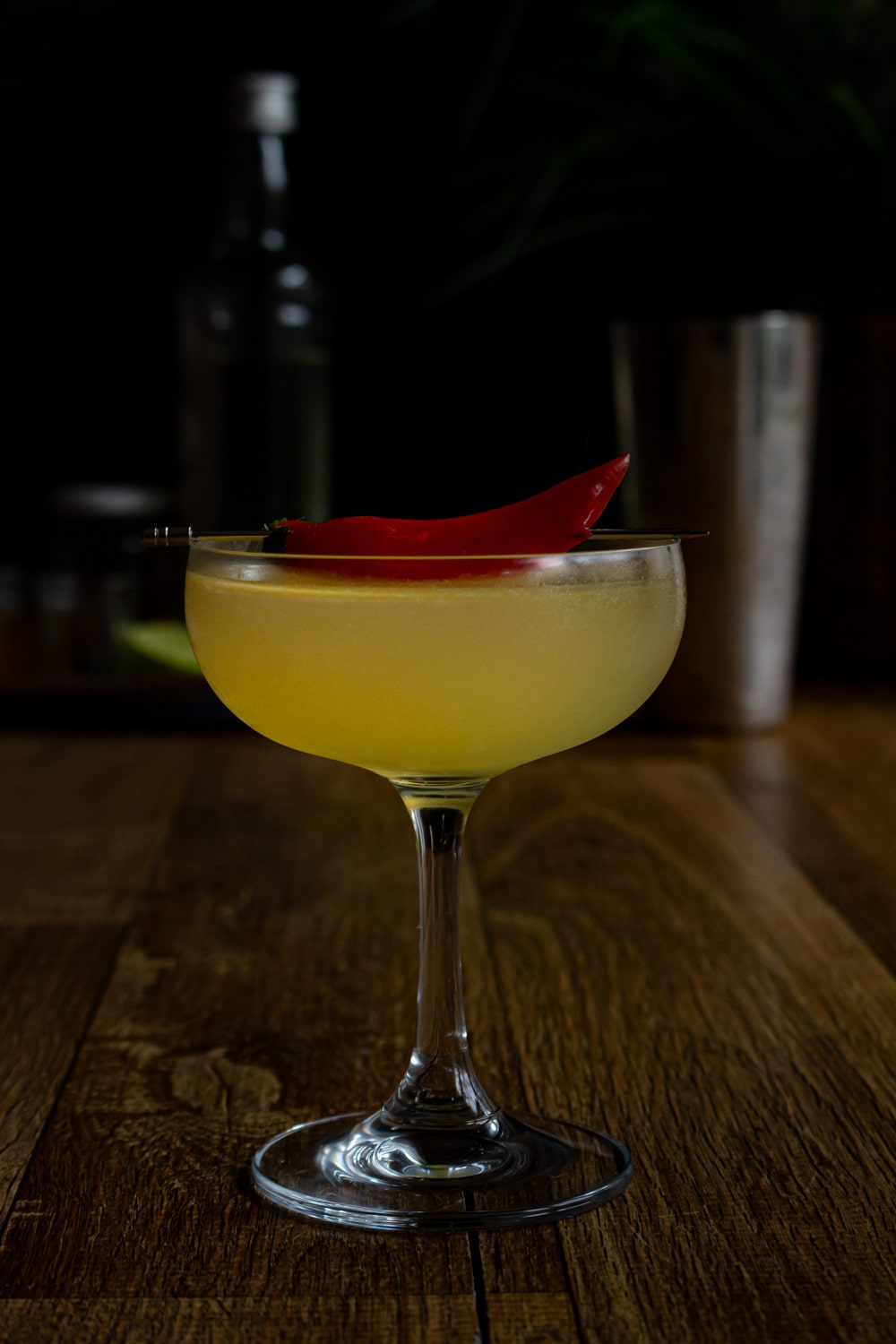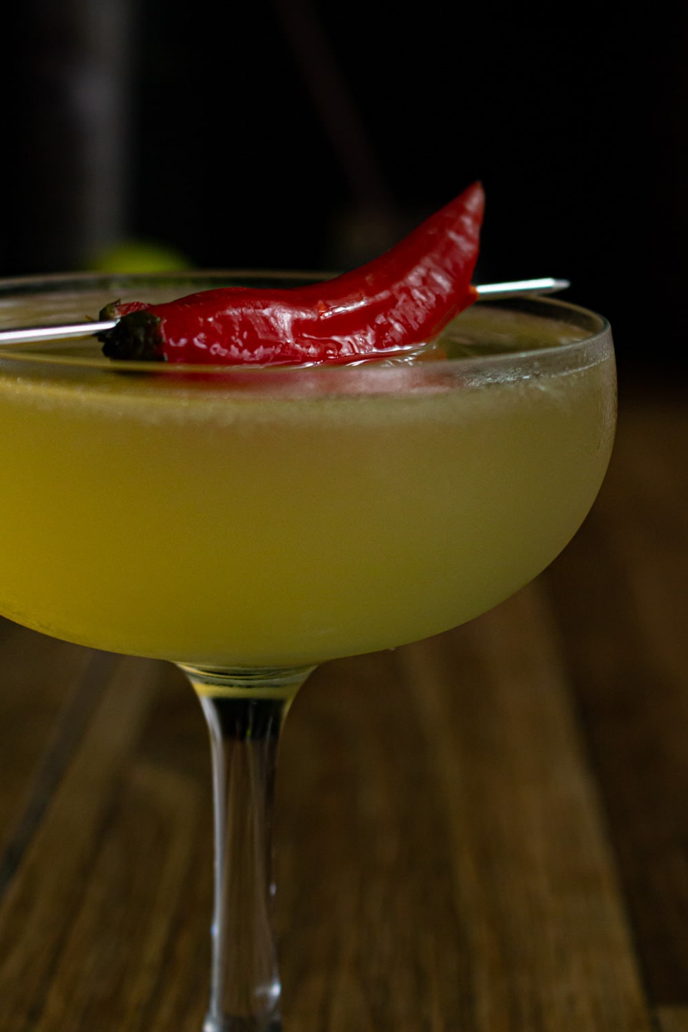 - Se for usar a pimenta inteira: esmague a pimenta na coqueteleira, junte os outros ingredientes e bata com bastante gelo. Coe em uma taça rasa e enfeite com uma pimenta na borda.